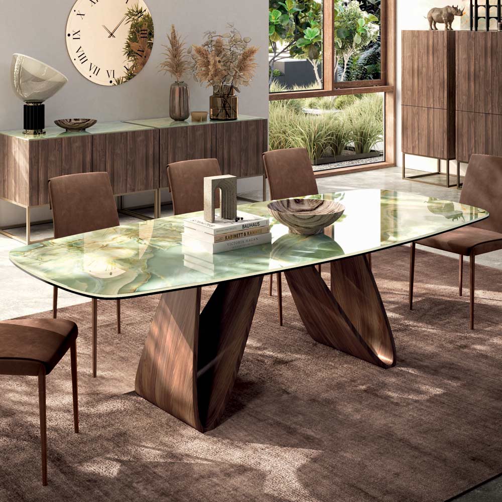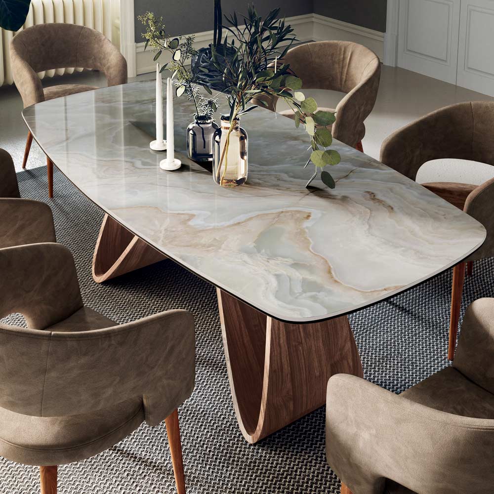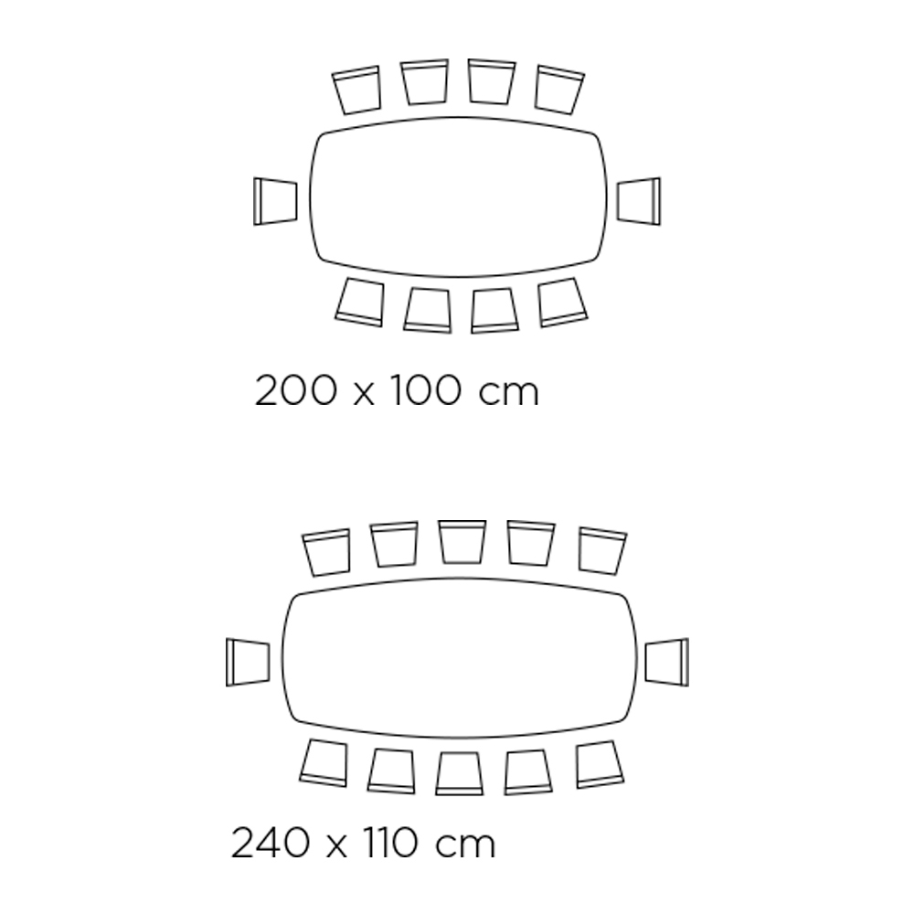 Gracias a la forma de la base y a los acabados de la tapa disponibles, la mesa es capaz de dar un