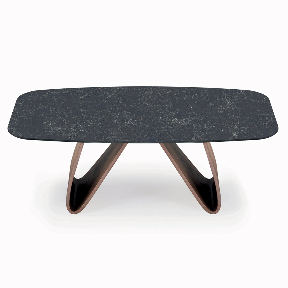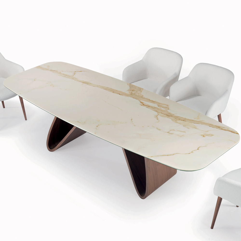Gracias a la forma de la base y a los acabados de la tapa disponibles, la mesa es capaz de dar un