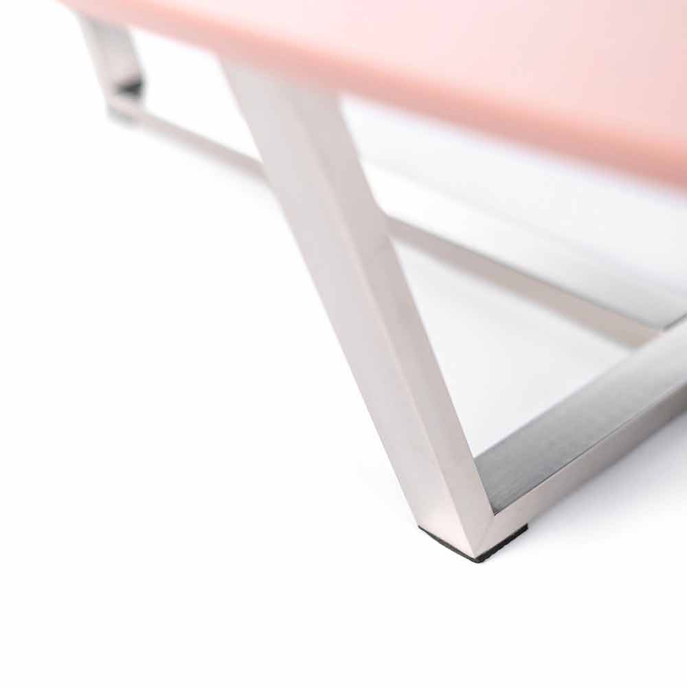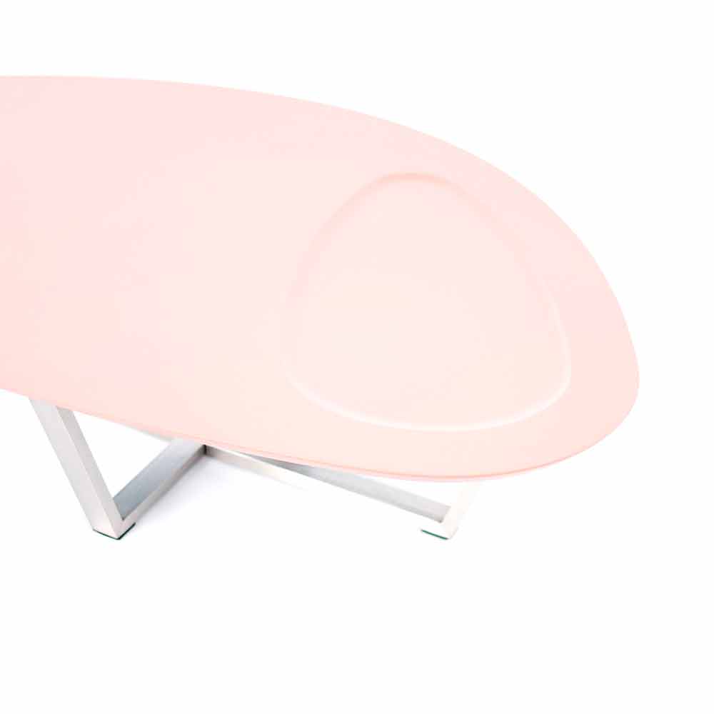 Donatella es una mesita con forma realizada con tapa de MDF y base de metal cromado.
