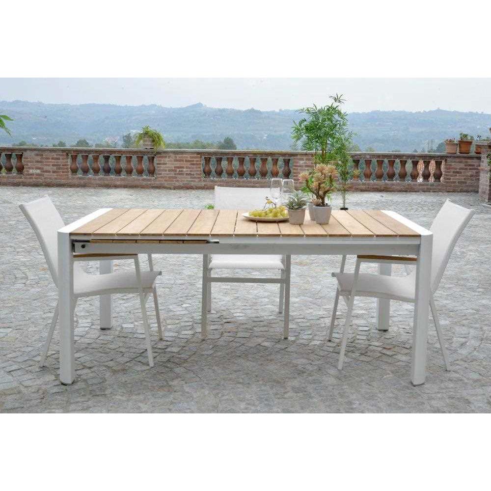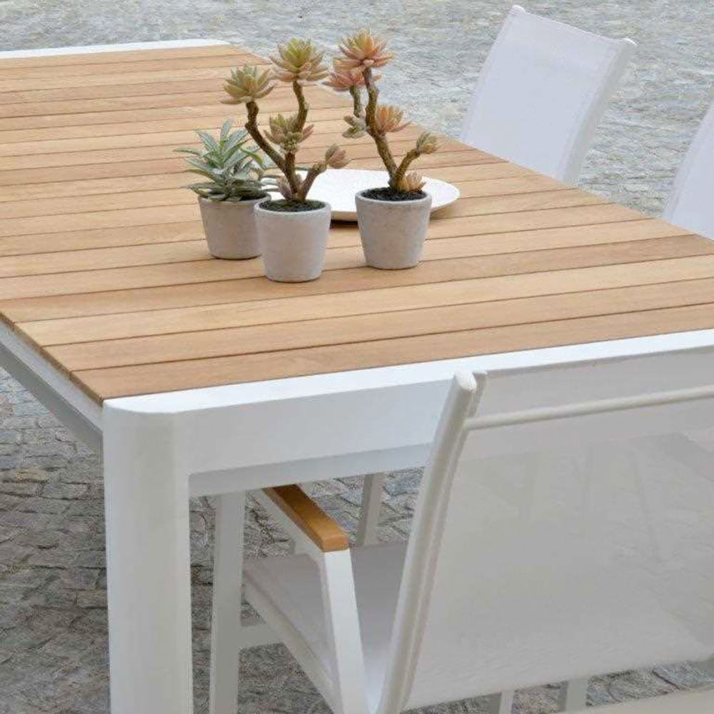 La mesa está diseñada para adaptarse a cualquier ocasión, extendiéndose fácilmente para acomodar a más invitados o encogiéndose para un uso diario más íntimo. La combinación de aluminio blanco y madera de teca no sólo es visualmente atractiva sino también extremadamente práctica, ofreciendo una superficie fácil de limpiar y mantener.