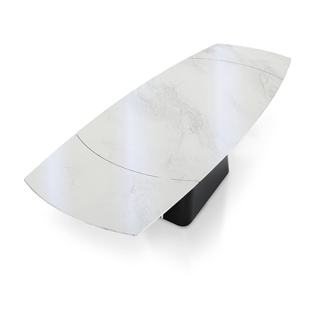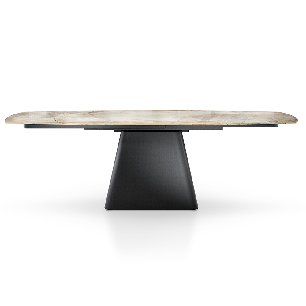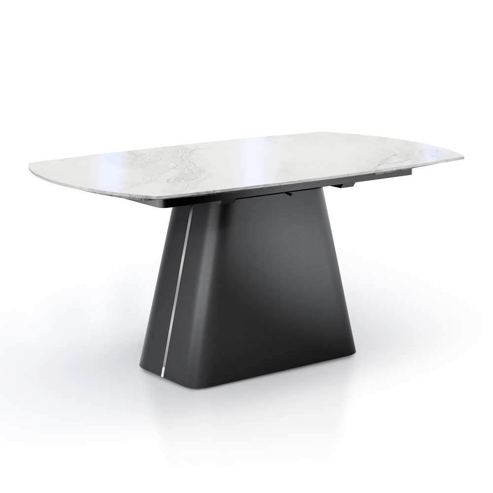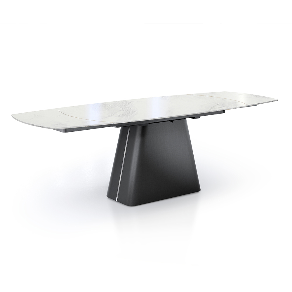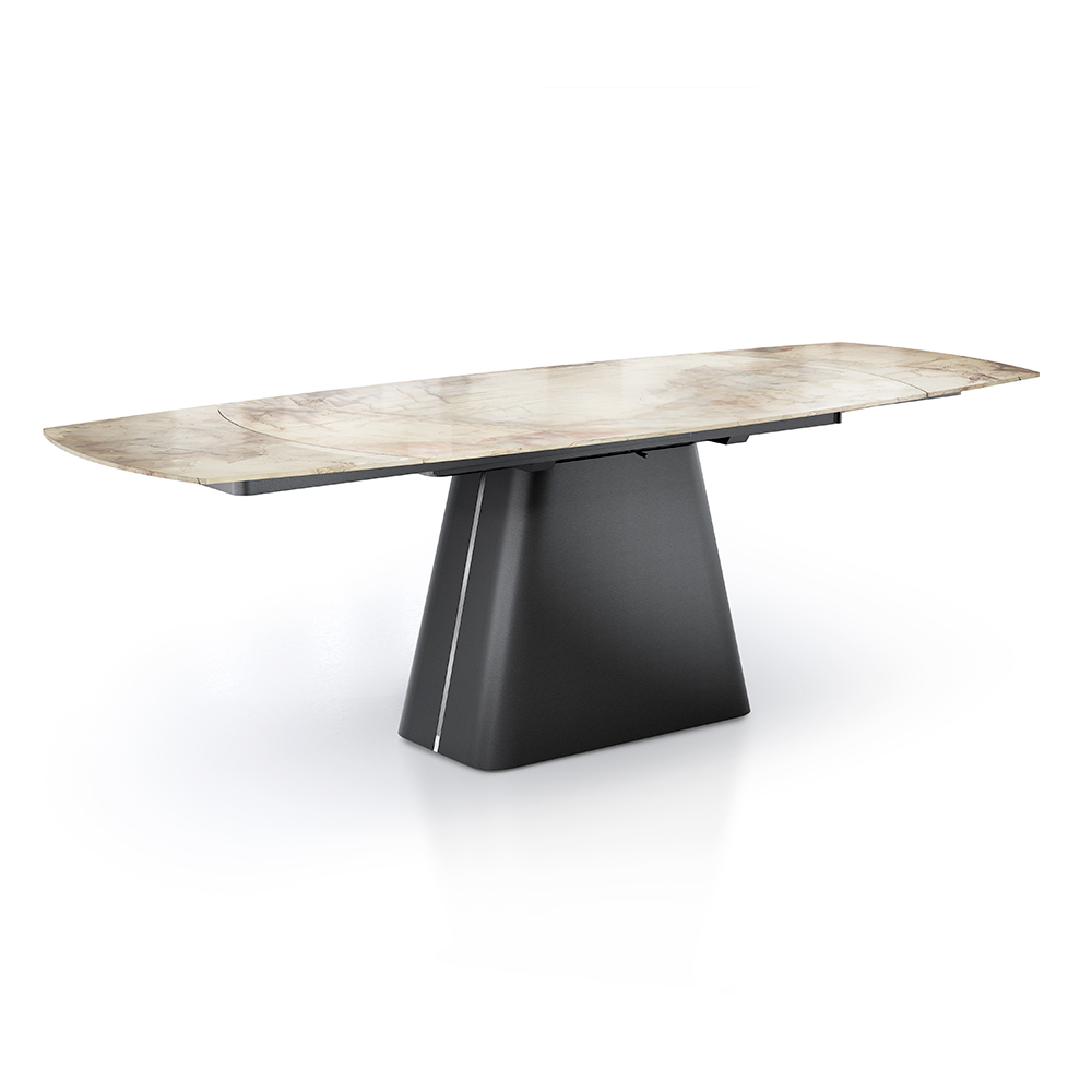 Esta mesa extensible es una obra maestra de diseño y funcionalidad, ideal para quienes quieren combinar elegancia y versatilidad en un solo mueble. La superficie se asienta sobre una base de metal negro, robusta y estilísticamente atrevida, y ofrece un impresionante contraste visual que atraerá todas las miradas en cualquier comedor.