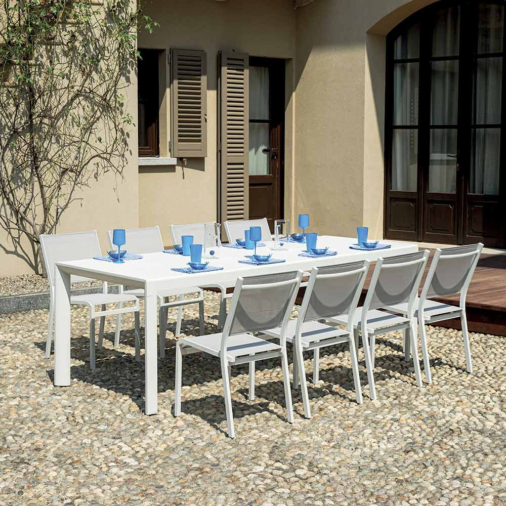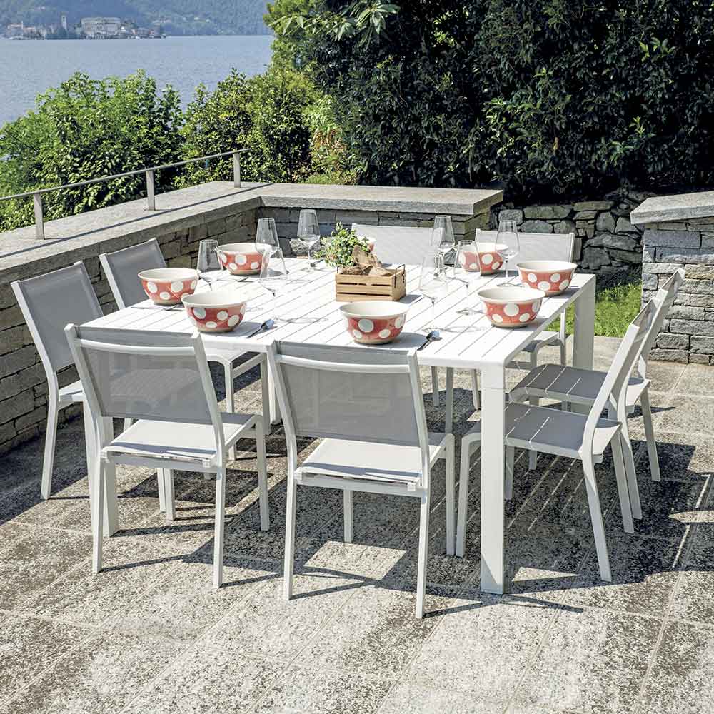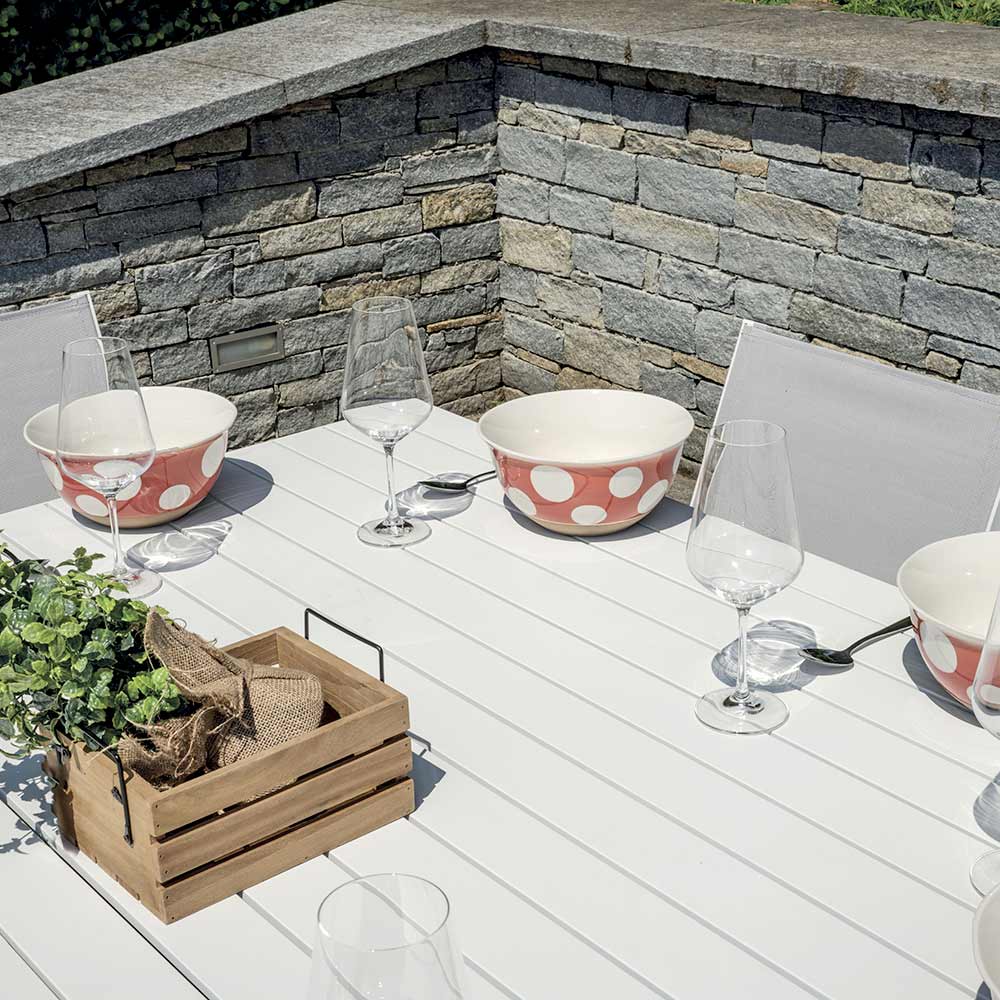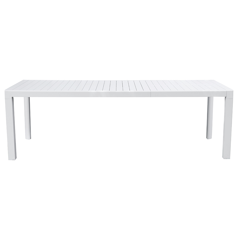 Elegancia, resistencia y practicidad se unen en esta mesa de aluminio blanca con tapa de listones, un mueble que combina funcionalidad y estilo moderno. Su acabado en blanco y sus líneas limpias la hacen adecuada para cualquier espacio exterior, desde el jardín hasta la terraza, añadiendo un toque de sofisticación atemporal.