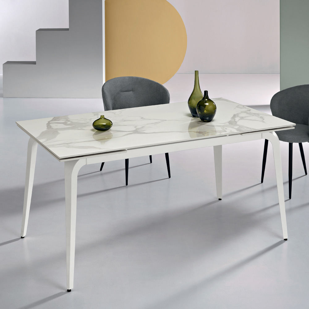 Mesa de comedor extensible de diseño moderno, ideal para amueblar con elegancia el salón o el comedor . La superficie está fabricada en piedra sinterizada con efecto mármol , un material duradero y de fácil mantenimiento que aporta un toque contemporáneo a cualquier espacio.