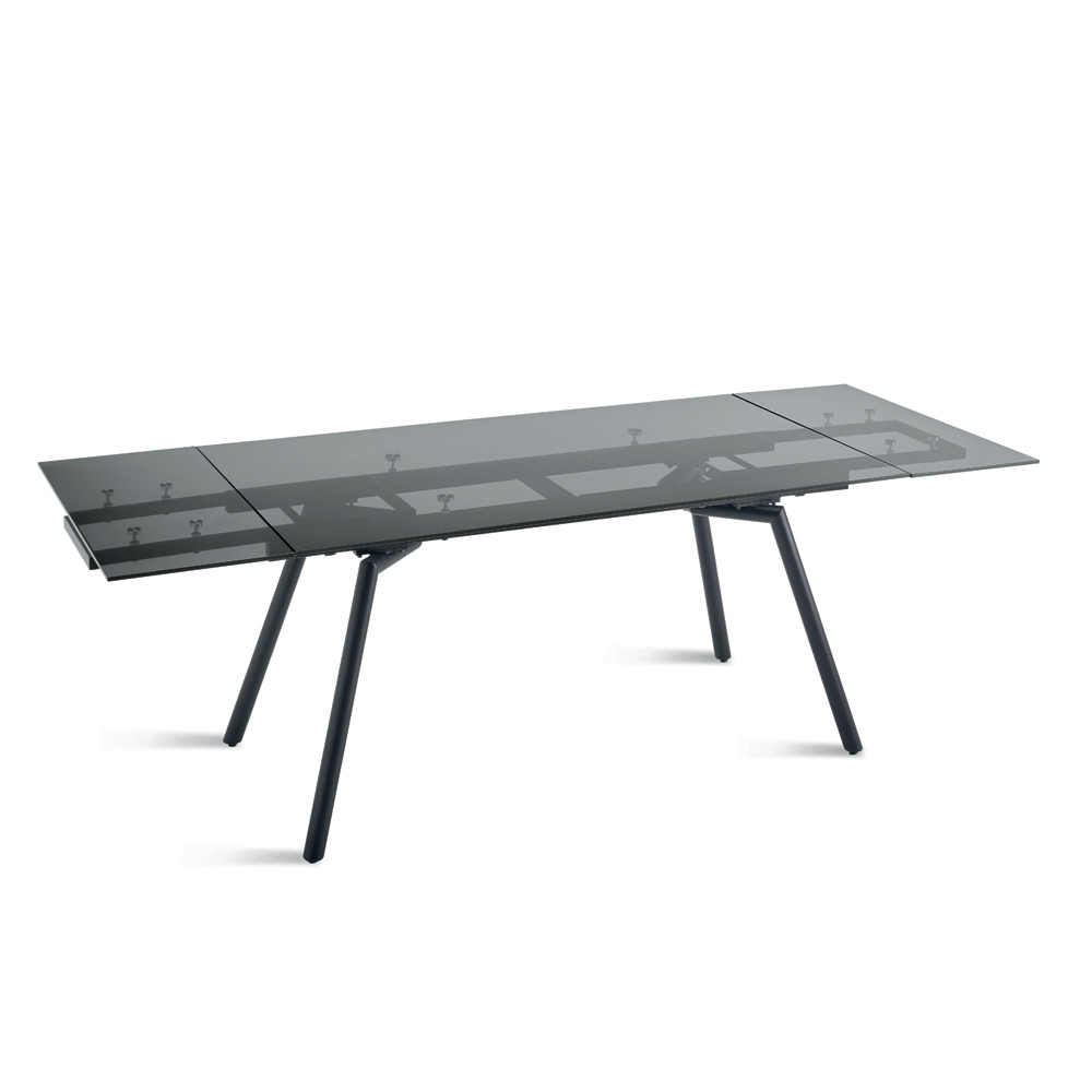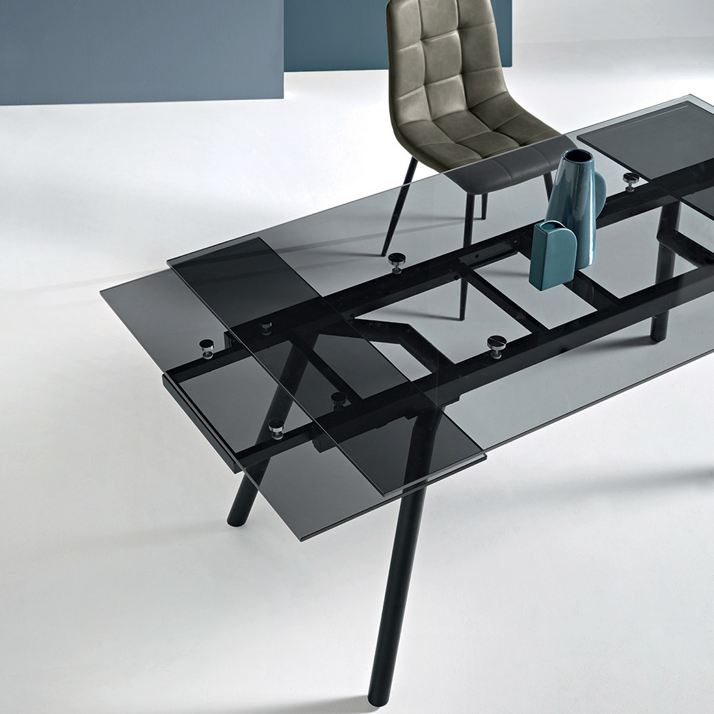 Una elegante y moderna mesa de comedor extensible , ideal para amueblar con estilo tu comedor o sala de estar . La superficie de cristal ahumado aporta luminosidad y ligereza visual al espacio, mientras que la base de metal pintado de negro garantiza estabilidad y durabilidad, creando un equilibrio perfecto entre estética contemporánea y funcionalidad.