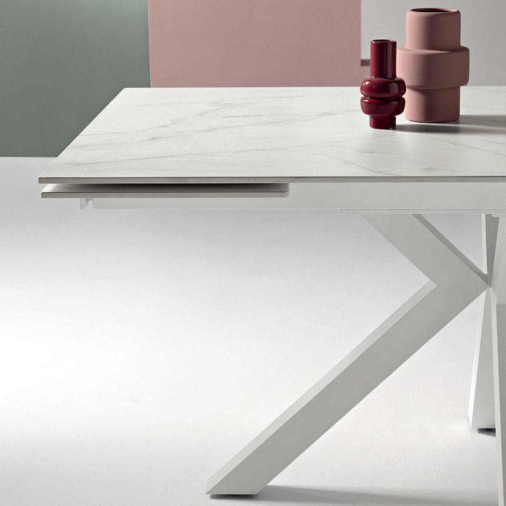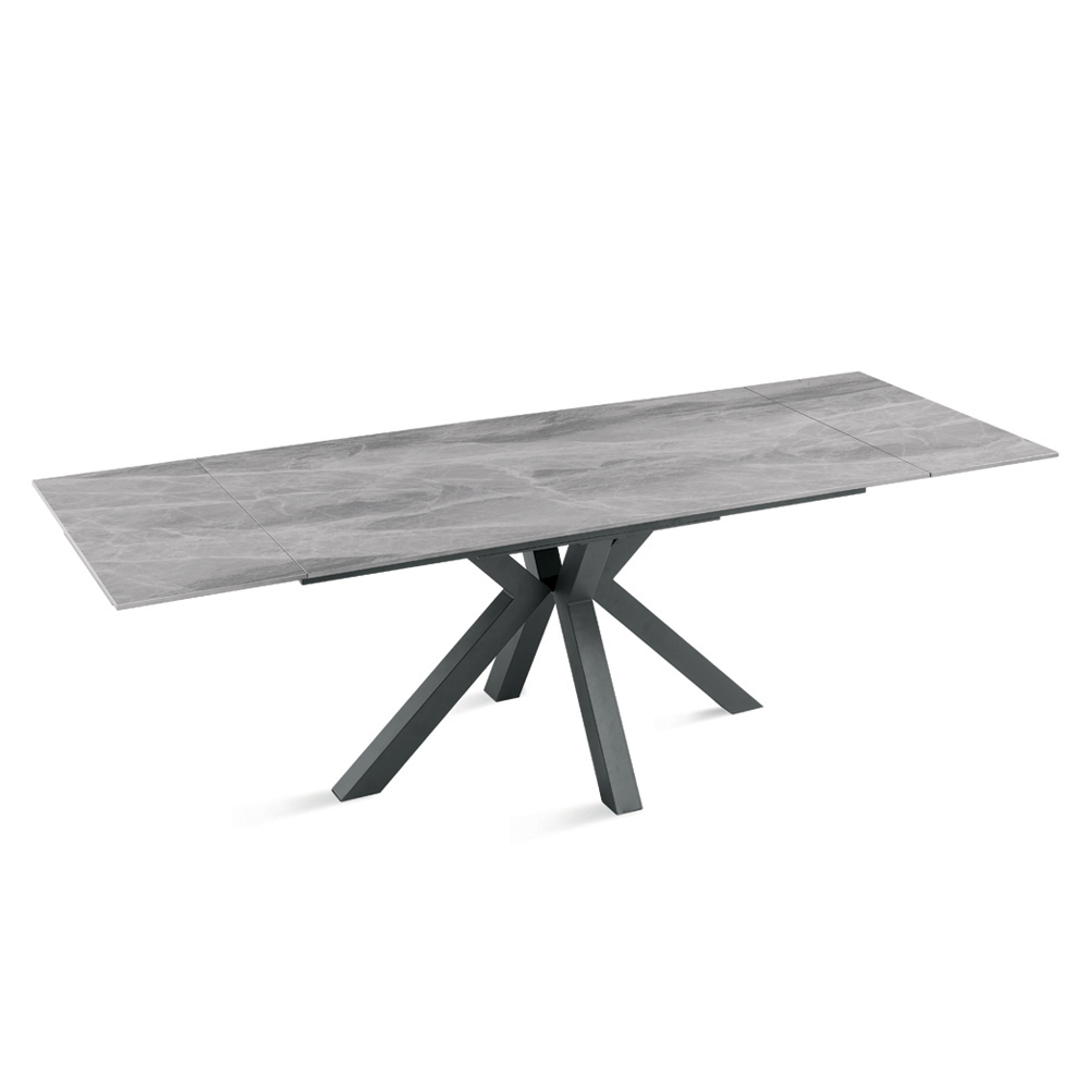 La mesa cuenta con dos extensiones de 40 cm que permiten ampliar rápidamente la superficie de 160 cm a 240 cm , ofreciendo más espacio para recibir a amigos y familiares durante comidas y cenas. La base de metal pintado garantiza estabilidad y robustez, aportando un toque contemporáneo y elegante al diseño.