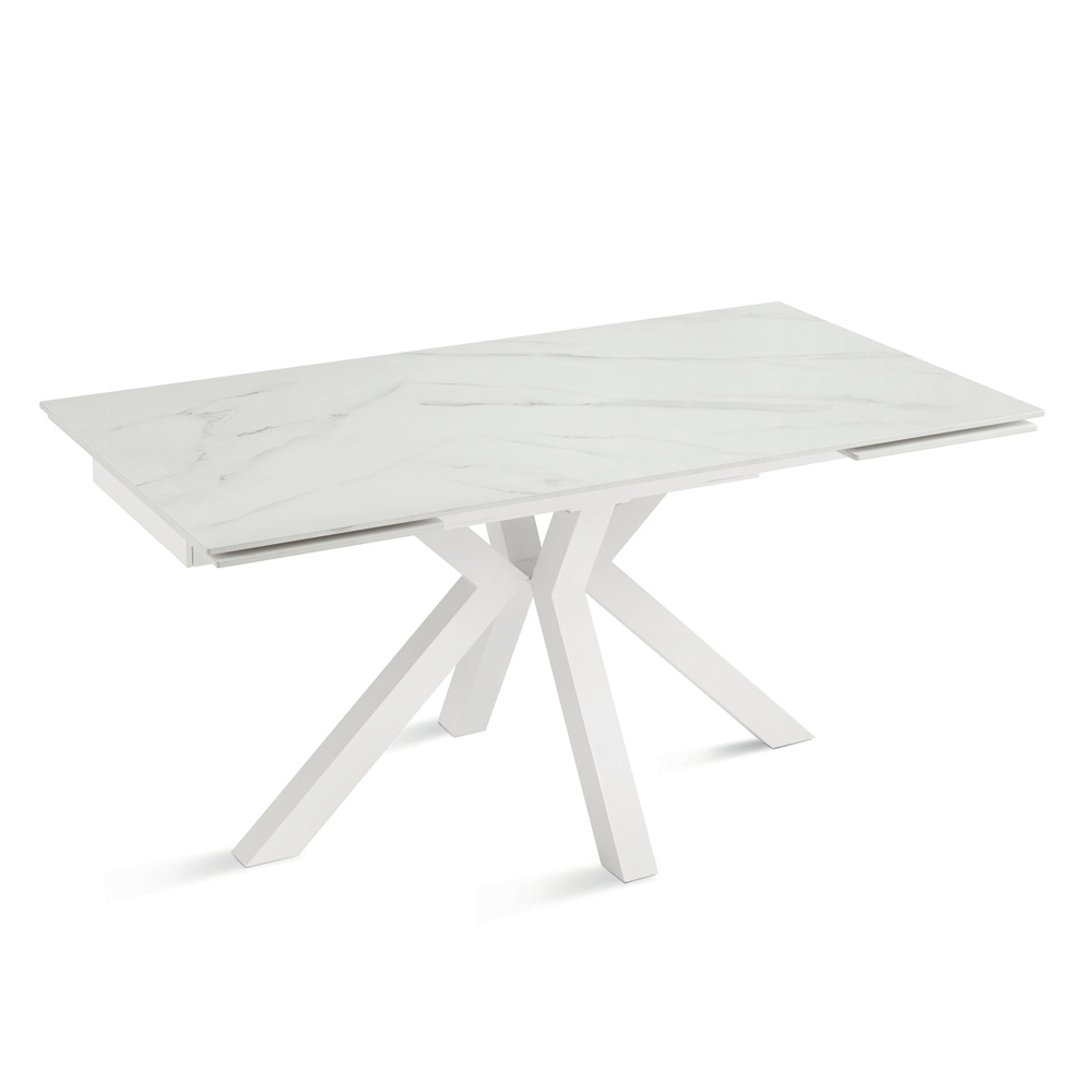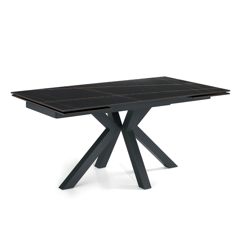 Elegante mesa de comedor extensible de diseño moderno, ideal para amueblar con estilo el salón o el comedor . Su tablero de piedra sinterizada con efecto mármol combina una estética refinada con durabilidad, ofreciendo una superficie resistente y fácil de limpiar, perfecta para el uso diario.