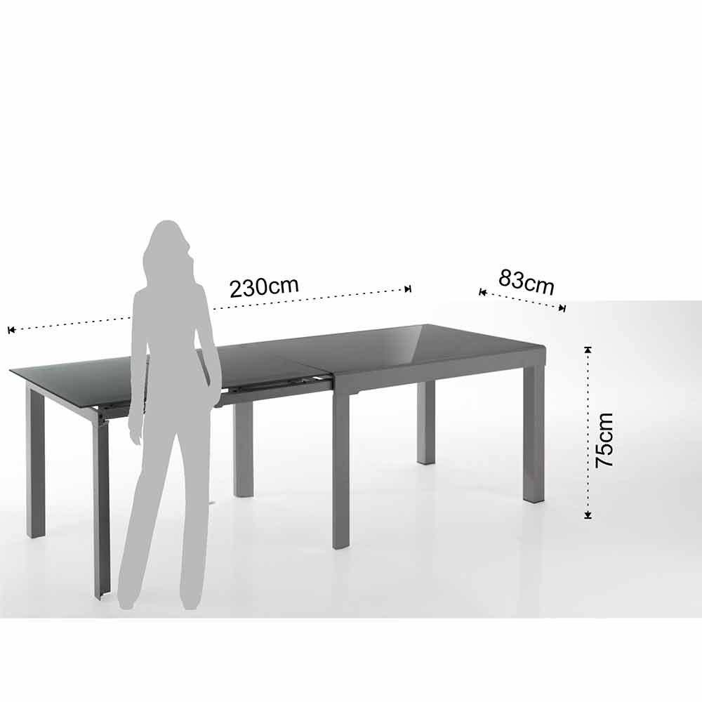 tapa de vidrio templado (espesor 8 mm) y una base de metal pintado, disponible en tres acabados diferentes: