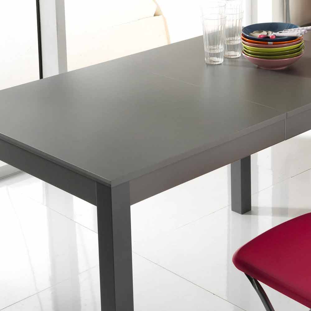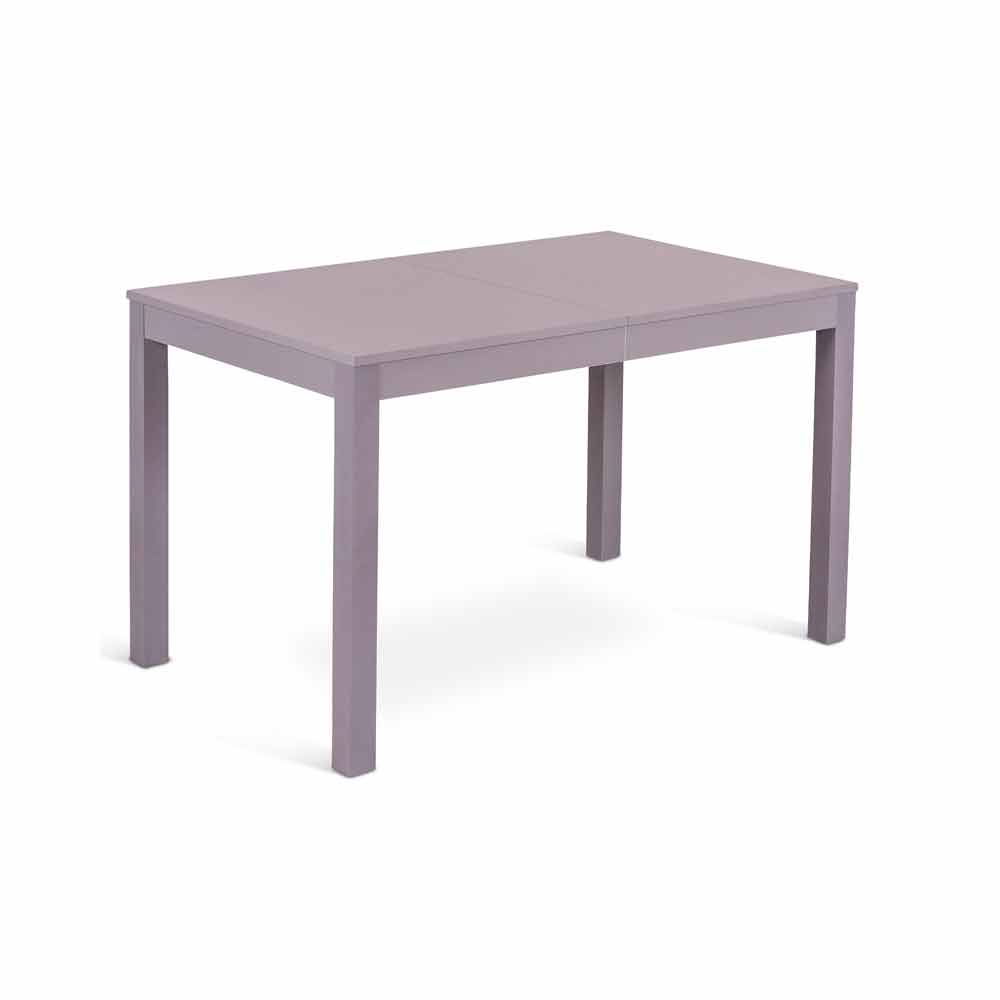 Mesa con base en madera maciza de haya y tapa en melamina. Tiene 2 extensiones de 40 cm cada una, alojadas dentro de la mesa. Disponible en diferentes colores.