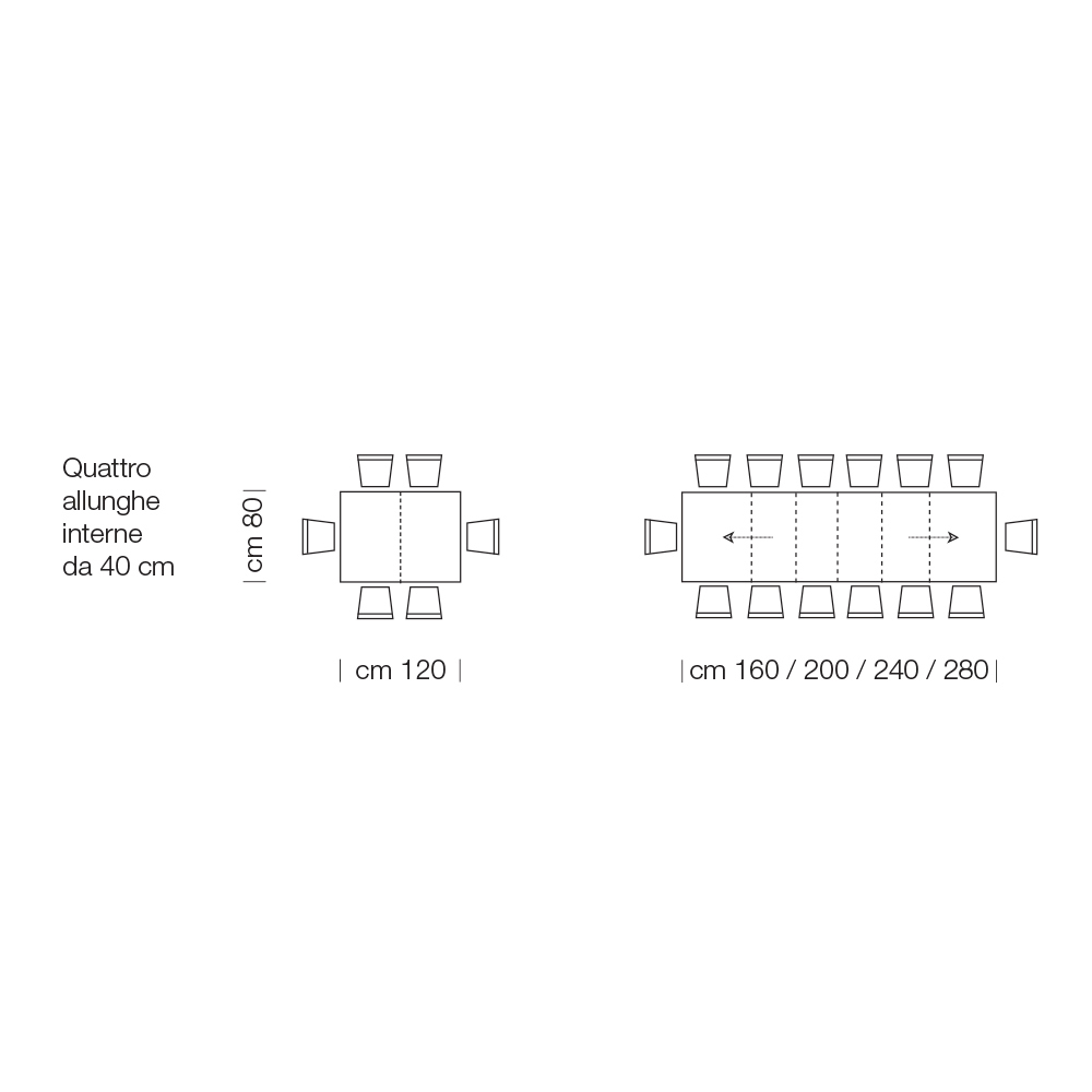 - L 120 (280) x P 80 x H 77 cm 14 plazas extensible con cuatro extensiones internas de 40 cm;