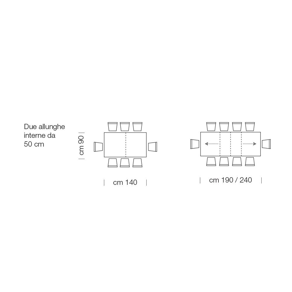 - L 140 (240) x P 90 x H 77 cm 10 plazas extensible con dos extensiones internas de 50 cm cada una;
