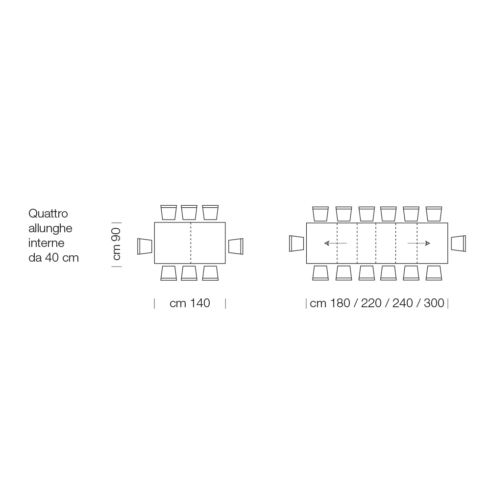 - L 140 (300) x P 90 x H 77 cm 14 plazas extensible con cuatro extensiones internas de 40 cm;