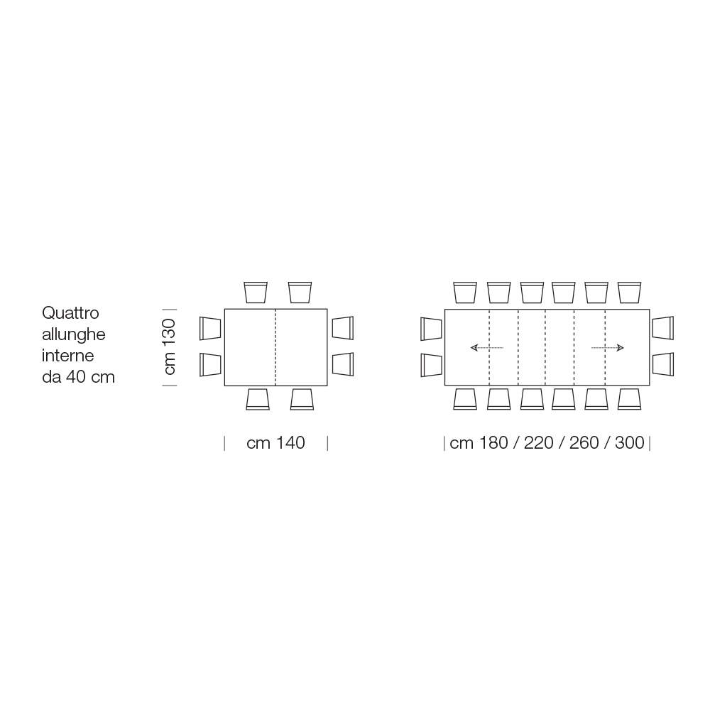 - L 140 (300) x P 130 x H 77 cm 16 plazas extensible con cuatro extensiones internas de 40 cm;