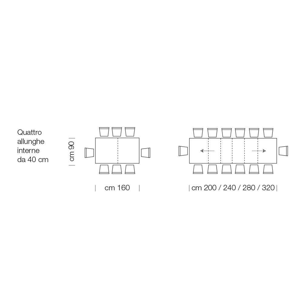 - L 160 (320) x P 90 x H 77 cm 14 plazas extensible con cuatro extensiones internas de 40 cm;