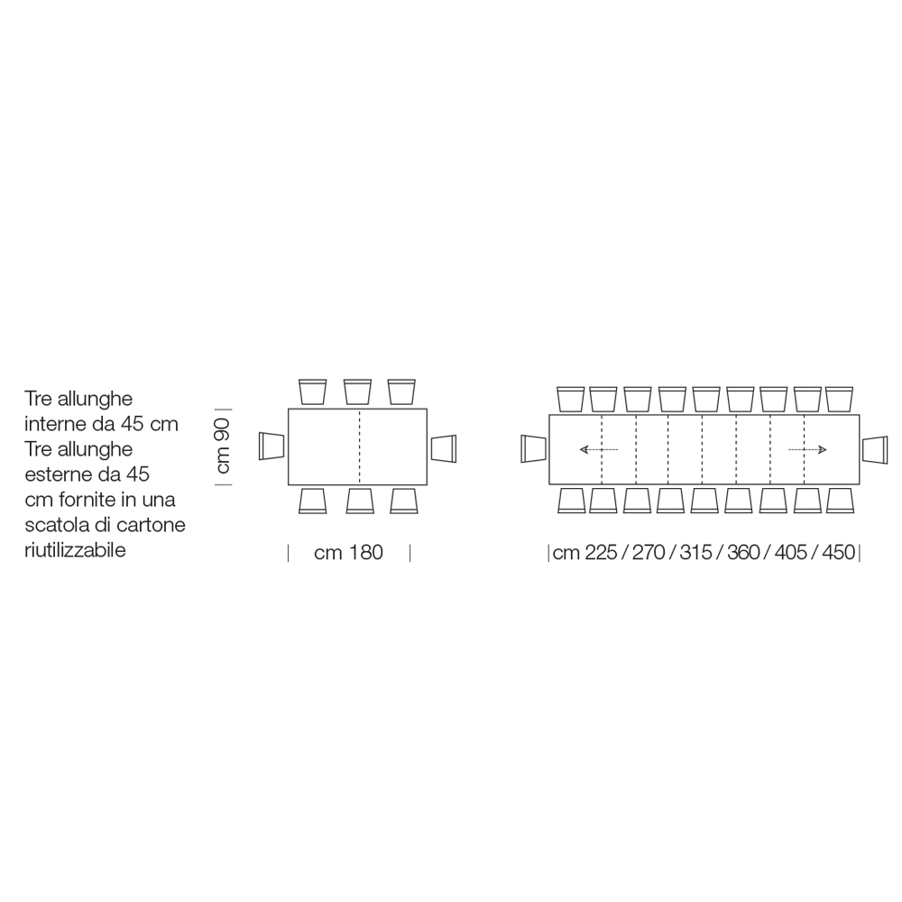 - L 180 (450) x P 90 x H 77 cm 20 plazas extensible con seis extensiones de 45 cm, tres internas y tres suministradas en una caja de cartón reutilizable;