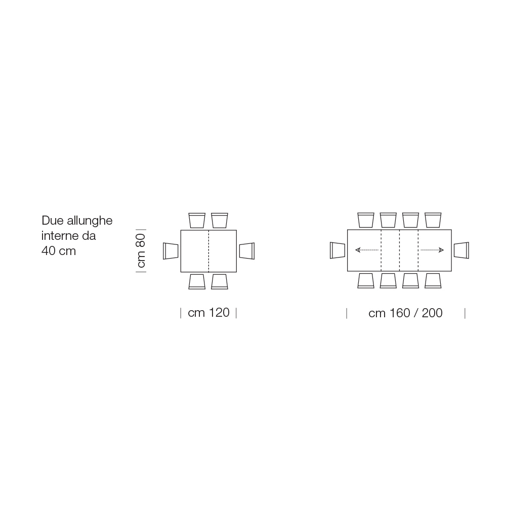 - L 120 (200) x P 80 x H 77 cm 10 plazas extensible con dos extensiones internas de 40 cm;