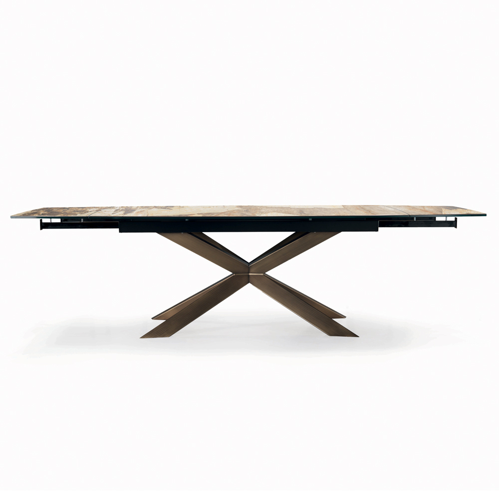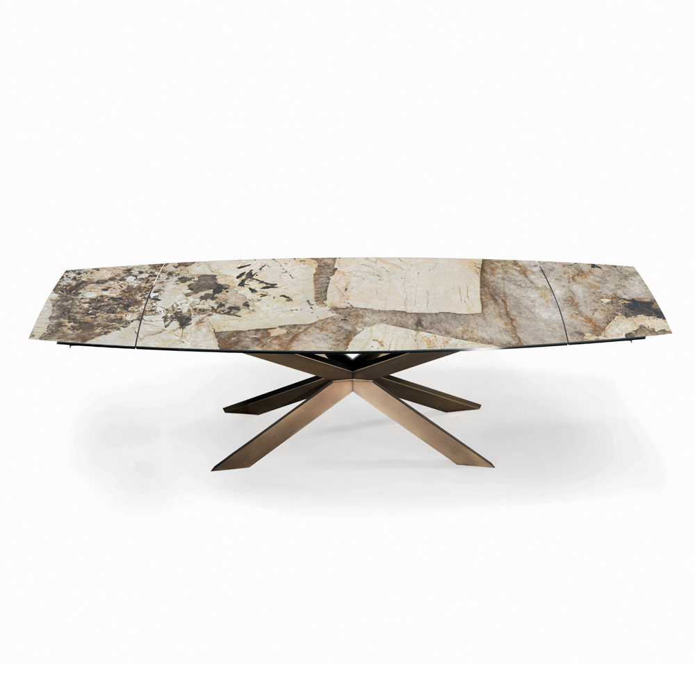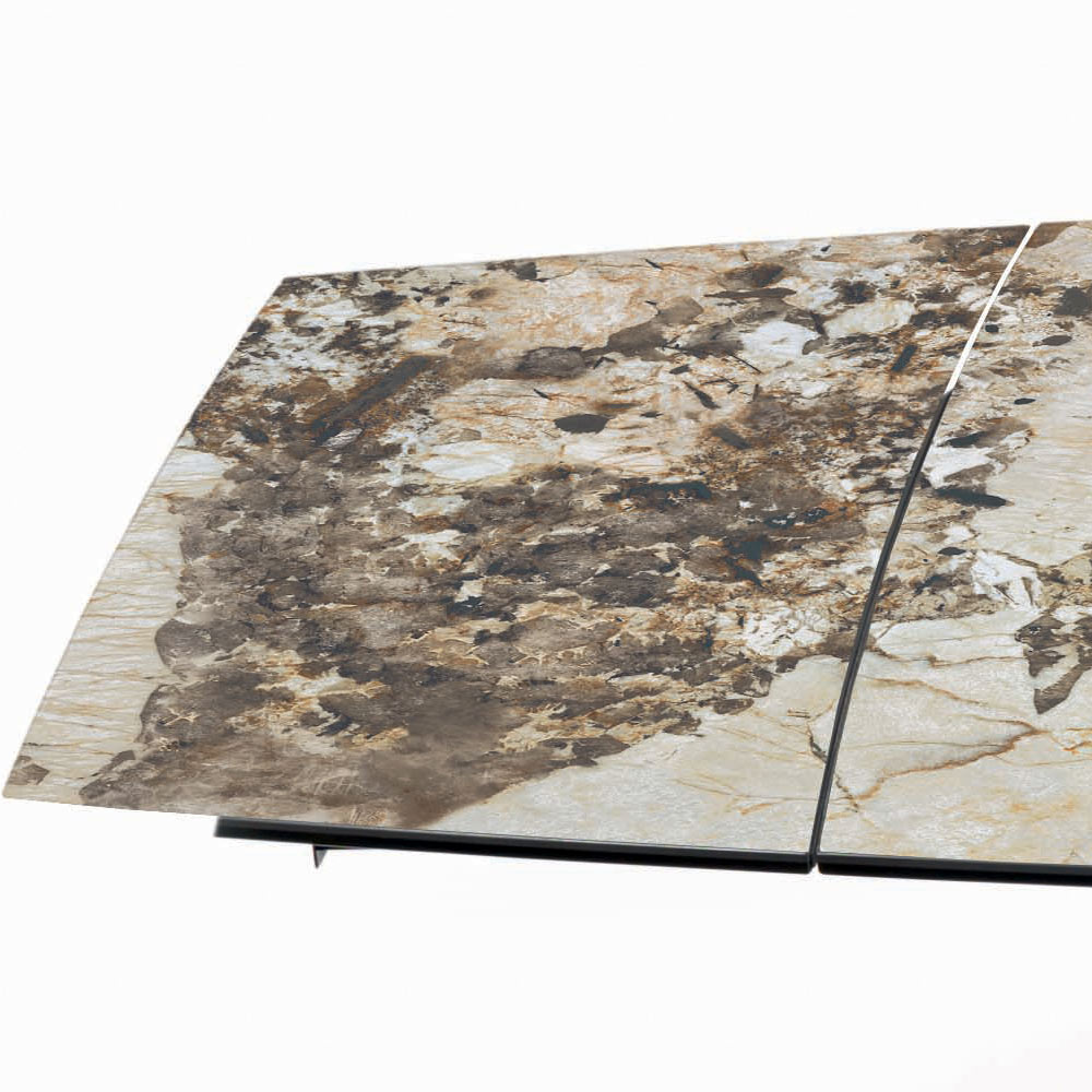 Mesa de salón extensible en forma de barril con extensiones integradas, tapa de cerámica con acabado deset soul pulido , canto