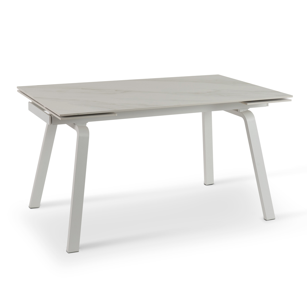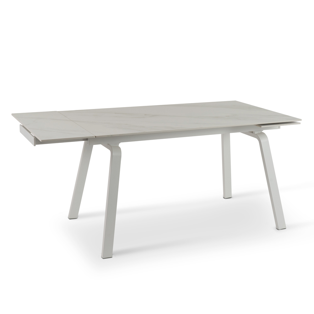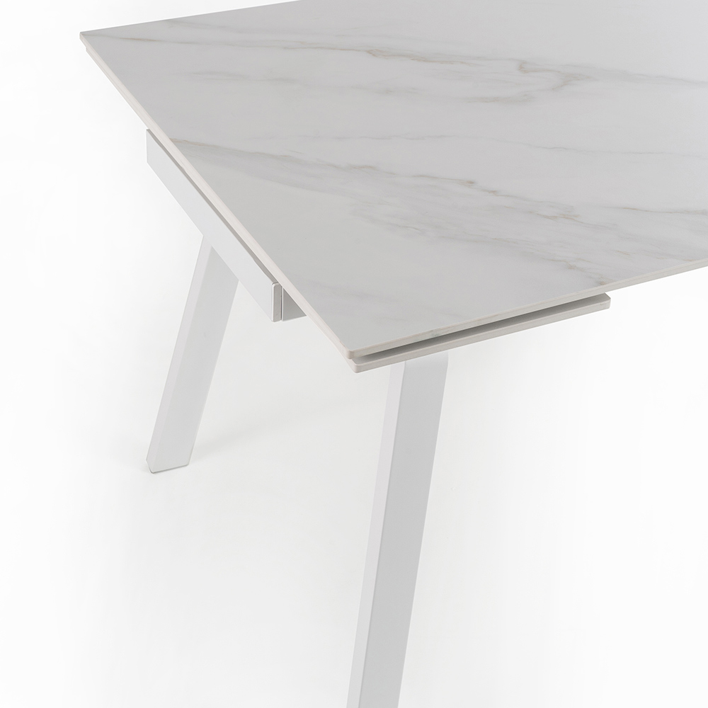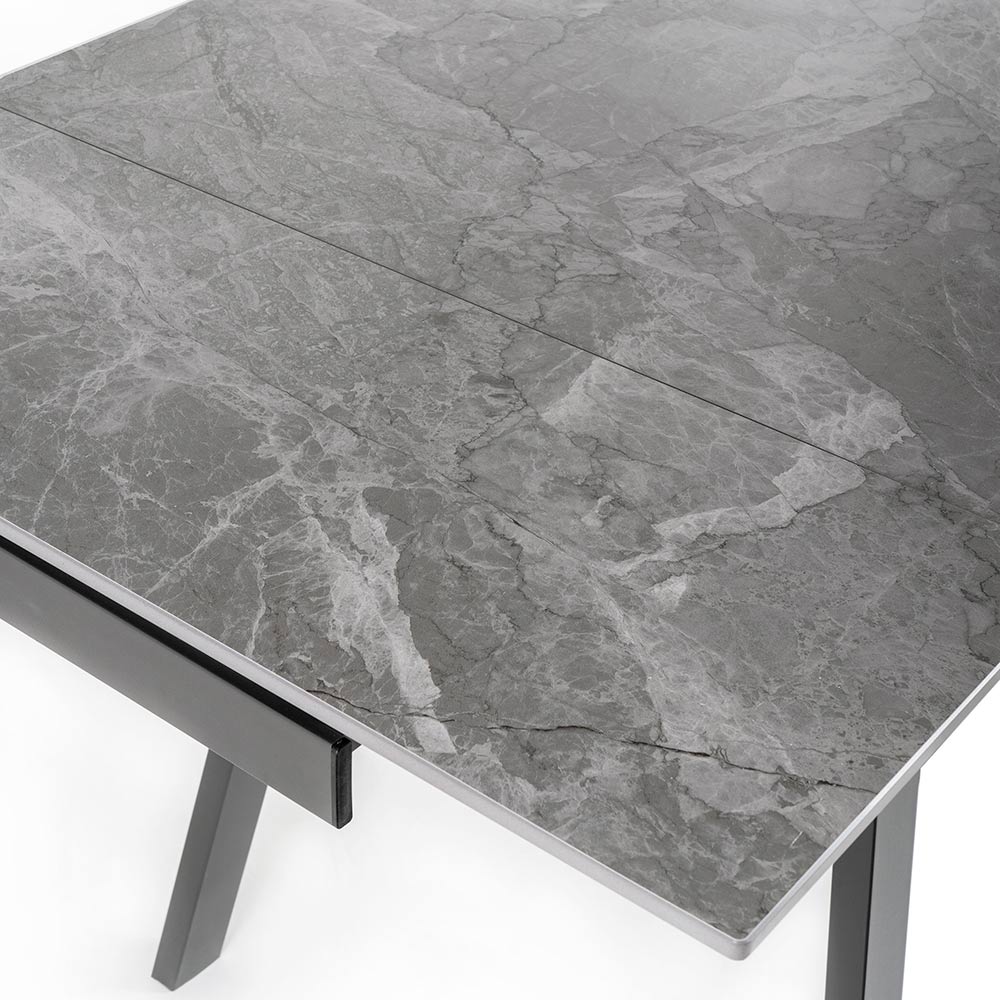 Mesa de comedor extensible de piedra sinterizada efecto mármol y metal.