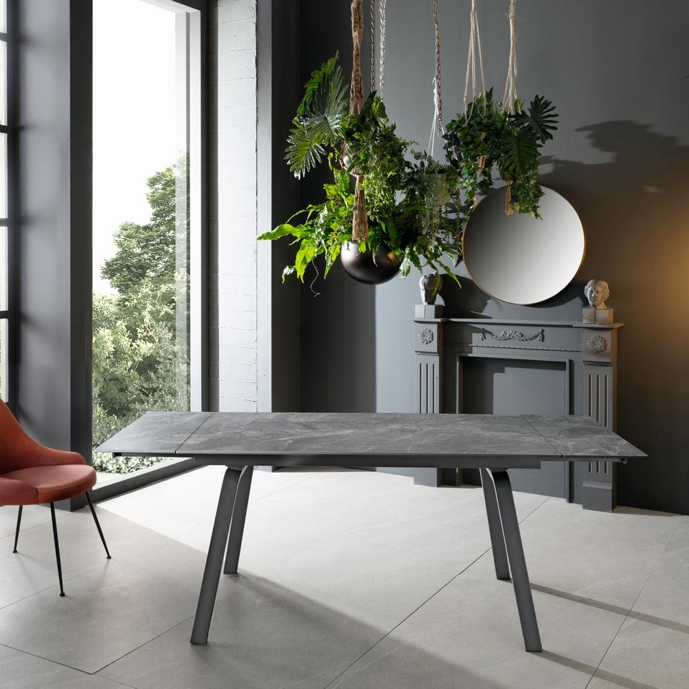 Lo que llama la atención es la fuerza expresiva de esta mesa extensible de estilo contemporáneo e industrial. Su diseño se caracteriza por el elegante tablero de piedra sinterizada que combina con buen gusto con la sólida base de metal. Ofrece muchas combinaciones posibles entre los acabados de la tapa rectangular y los acabados de la base, satisfaciendo la expresión y el gusto personal y reflejando el espíritu del contexto en el que se inserta. Gracias a su extensibilidad consigue convertirse en el aliado perfecto en la creación de espacios de convivencia únicos y cálidos.