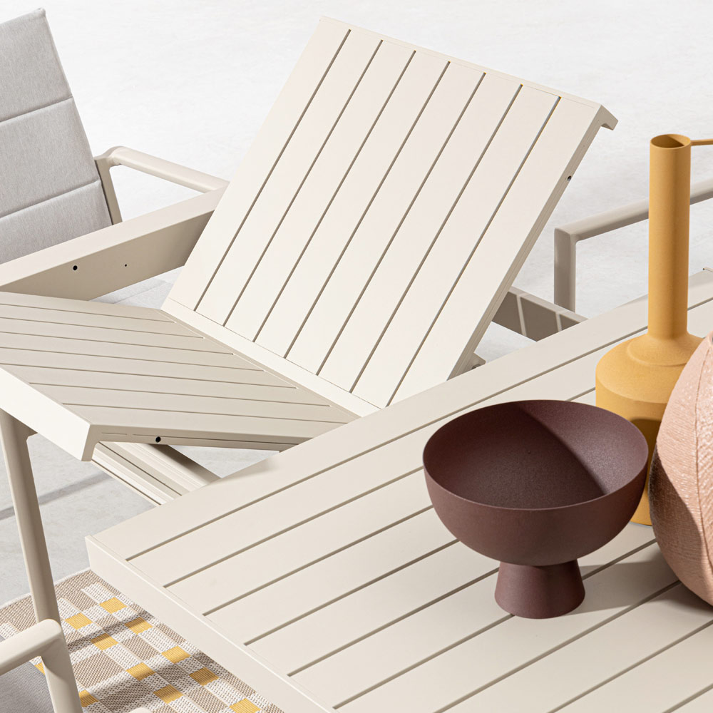 Esta mesa de jardín es una auténtica joya de diseño minimalista y funcional . Su superficie de aluminio de alta calidad, caracterizada por líneas limpias, evoca un estilo moderno y sofisticado que no pasa desapercibido. Los colores neutros lo hacen extremadamente versátil y apto para cualquier ambiente exterior, desde el balcón urbano hasta el patio de una villa de campo. No sólo estéticamente agradable, sino también extremadamente práctico y duradero ; Esta mesa está construida para resistir los elementos, asegurando durabilidad y estabilidad en el tiempo. Con sus líneas simples y su elegante silueta, esta mesa se convierte en protagonista de cada momento agradable al aire libre, ofreciendo el máximo confort y hospitalidad . Expresión de puro estilo contemporáneo , esta mesa de jardín es la elección ideal para quienes aman acoger, vivir y compartir su vida al aire libre con clase y sencillez .