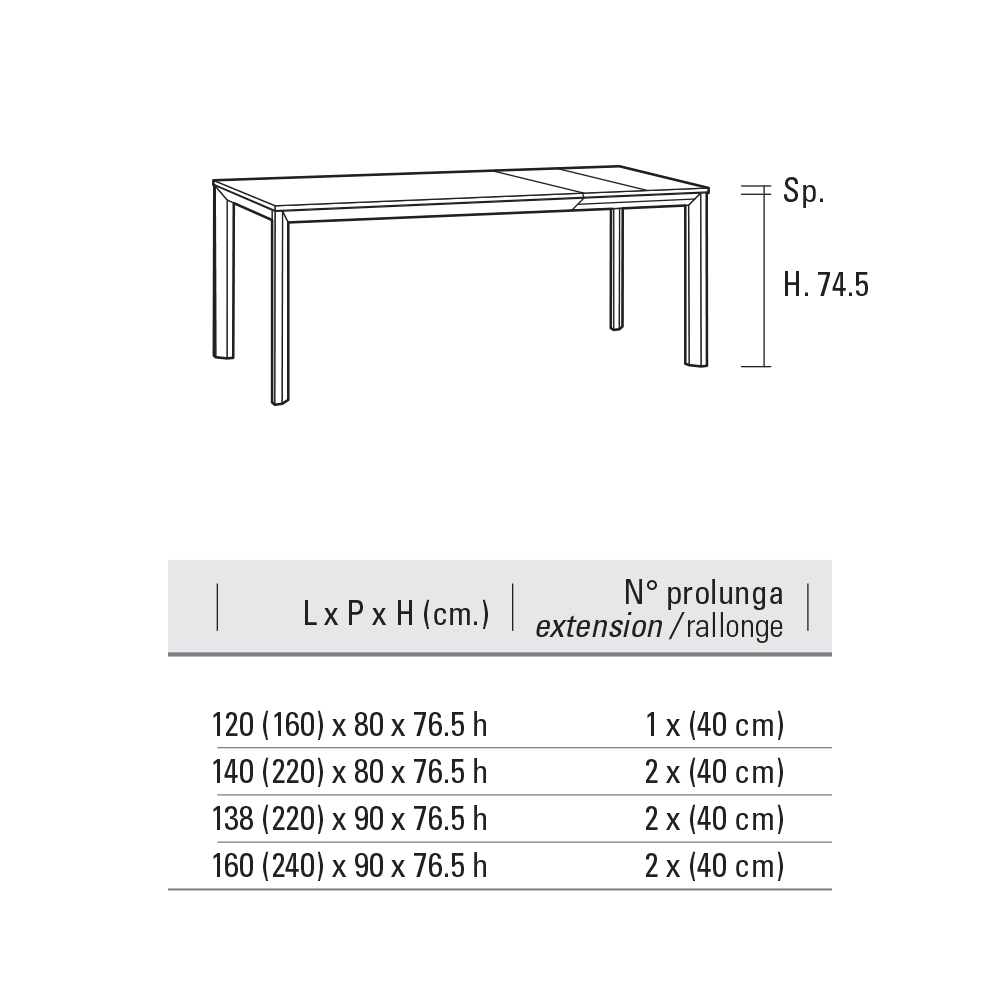 - L 140/220 x P 80 x H 76,5 cm (2 extensiones);