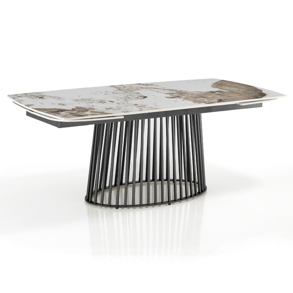 Esta mesa extensible es una auténtica expresión de arte y funcionalidad , perfecta para quienes quieren añadir un toque de sofisticación única a su hogar o entorno profesional. El tablero, realizado en cerámica efecto mármol, presenta un rico mapa de vetas que cuentan una historia de belleza natural inigualable.
