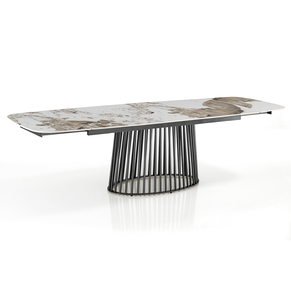Sostenida por una base de metal que presenta un intrincado diseño acanalado, esta mesa combina robustez y estilo escultórico . La capacidad de estirarse ofrece una versatilidad excepcional, encajando perfectamente tanto en cenas íntimas como en reuniones grandes, asegurando que cualquier ocasión se celebre con elegancia.