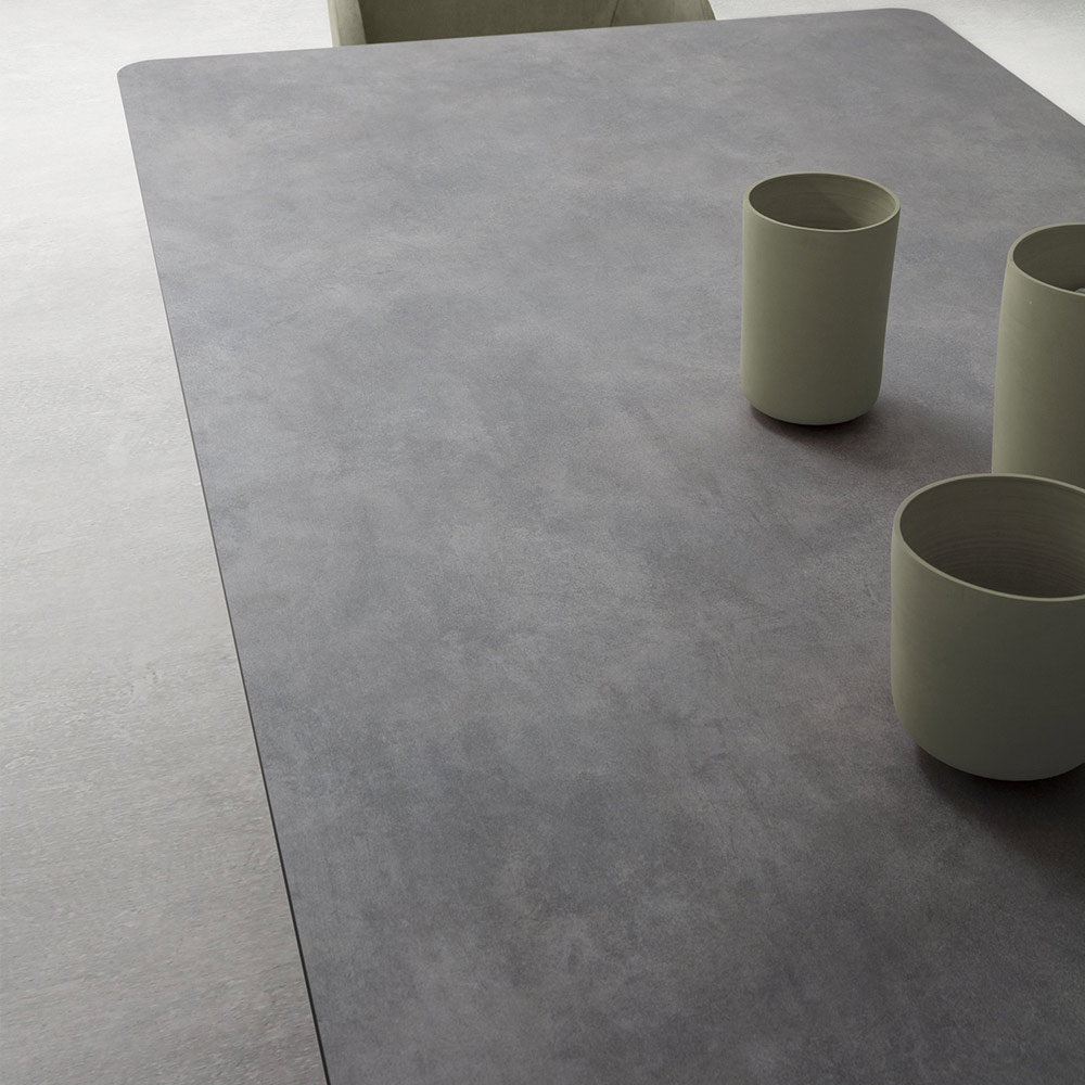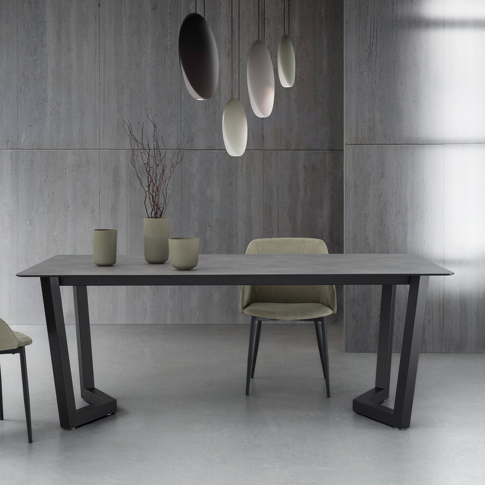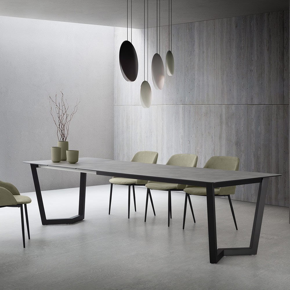 Mesa de cocina extensible con base de metal pintado con polvos epoxi en acabado negro, tapa estratificada de HPL disponible en diferentes acabados y guía para extensiones en aluminio pintado con prácticos patines, fabricado en Italia . Su estética se centra íntegramente en un estilo funcional y moderno , características fundamentales para crear una armonía exclusiva dentro de la estancia.