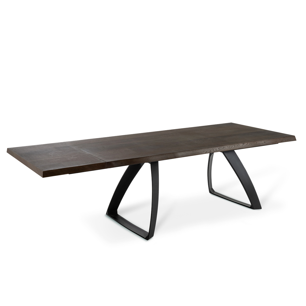 Mesa de comedor extensible en chapa de roble y aluminio.