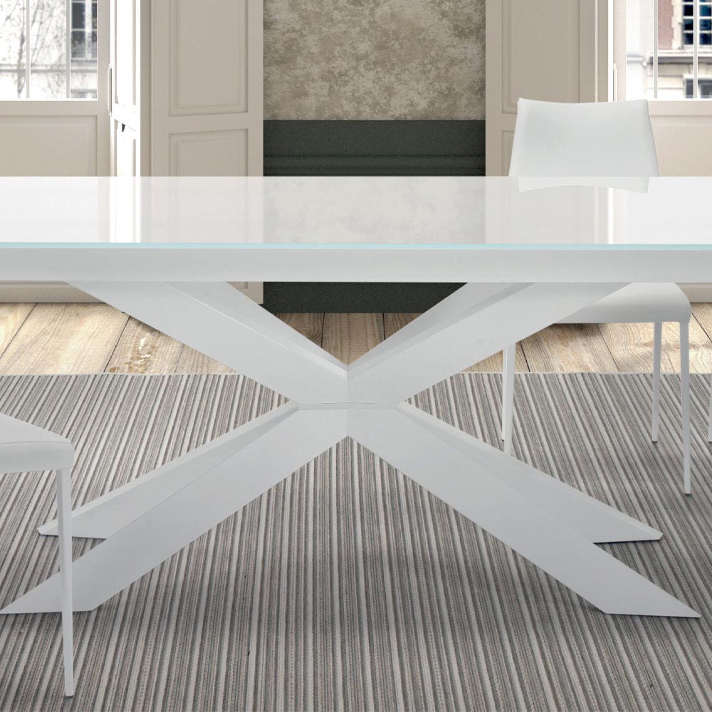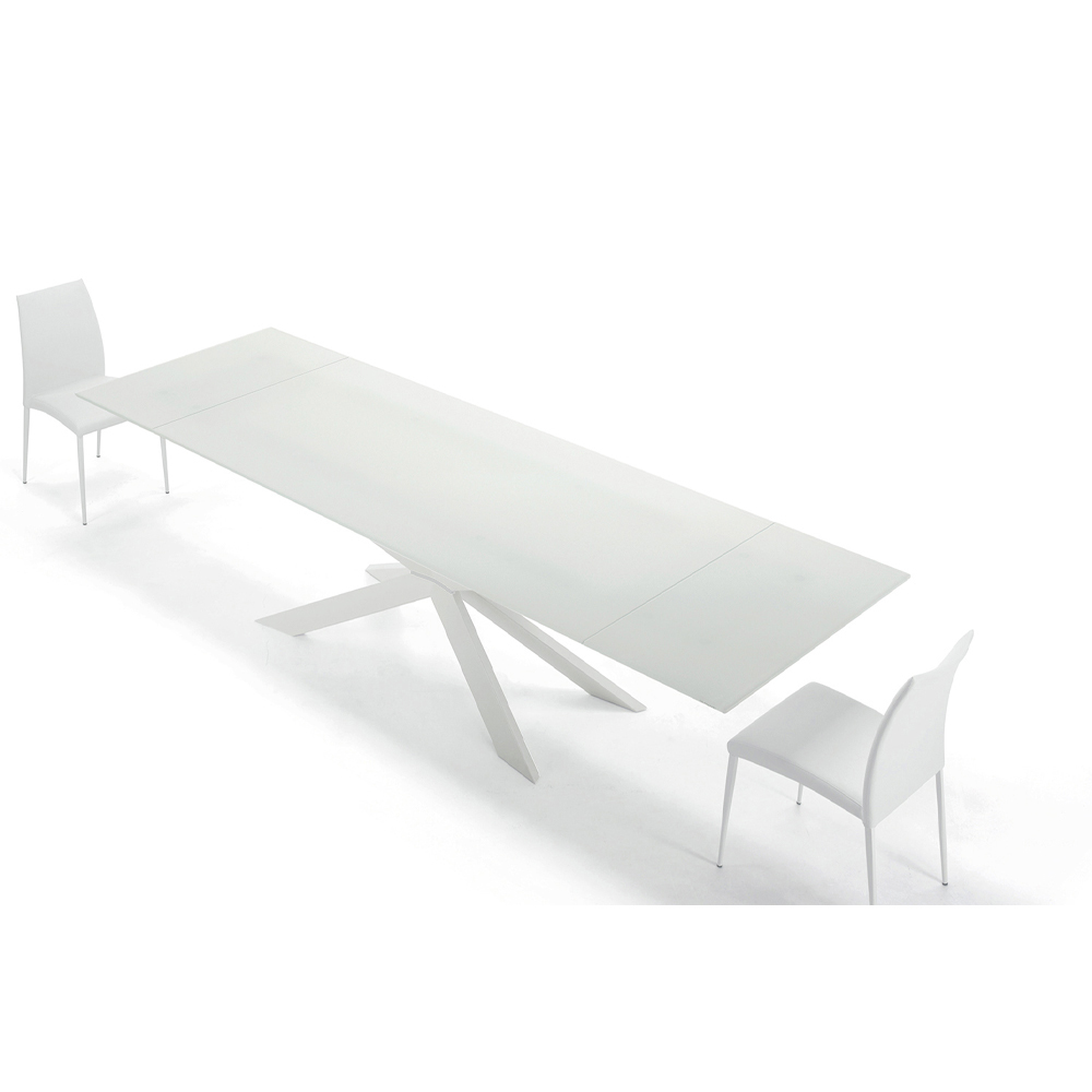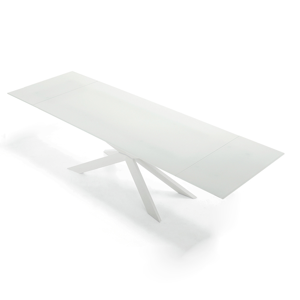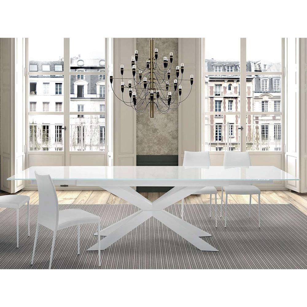 Mesa moderna extensible hasta 278 cm con tapa de cristal templado y base de acero blanco, fabricada en Italia.