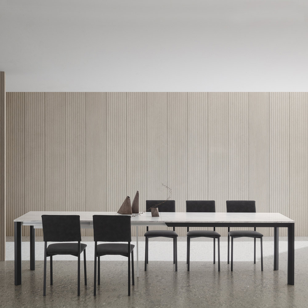 Mesa de cocina extensible hasta 334 cm fabricada en Italia con estructura de aluminio anodizado acabado negro mate, tapa de hpl con guía de aluminio sobre deslizadores de resina acetálica Disponible en diferentes acabados y en cuatro tamaños diferentes.