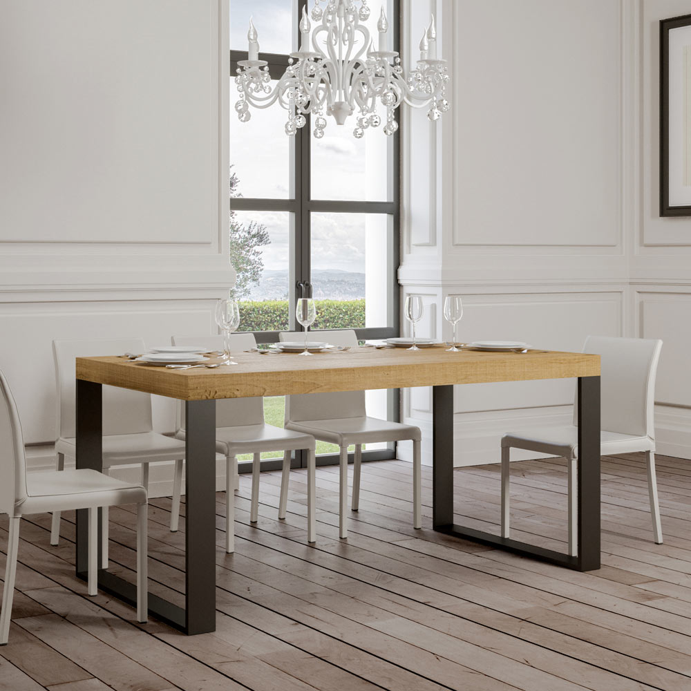 Descubra la esencia del diseño con esta mesa extensible, una obra maestra de flexibilidad y estilo. La resistente estructura de hierro combina a la perfección con el sobre de madera, una combinación que promete añadir un toque de elegancia moderna a cualquier espacio.