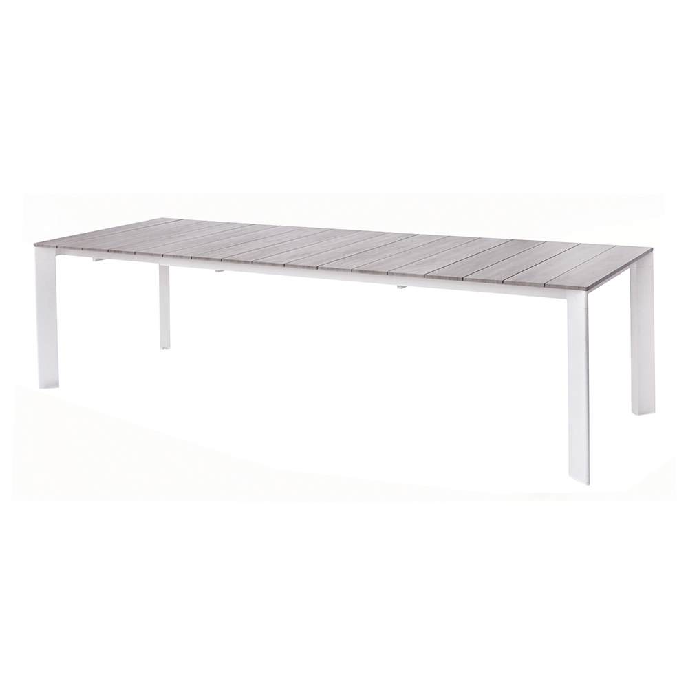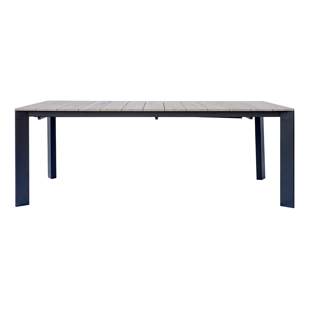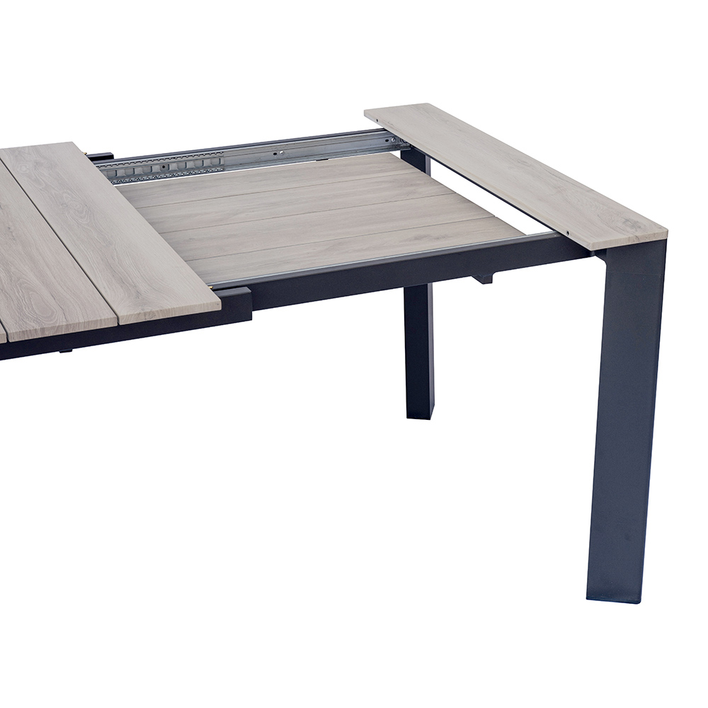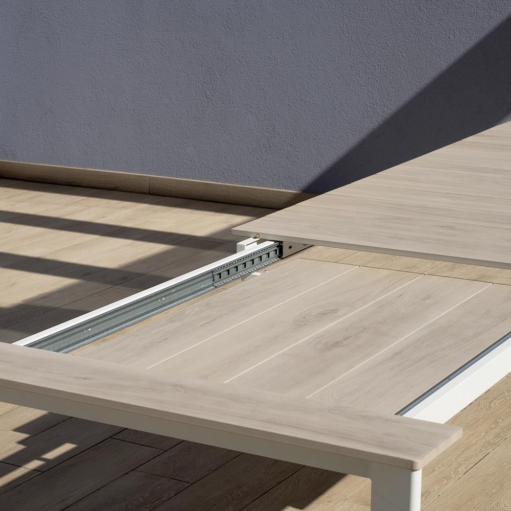 El tablero de aluminio con efecto madera combina la calidez estética de la madera natural con la durabilidad del aluminio, garantizando una superficie elegante, duradera y de fácil mantenimiento. El sistema de extensión con patas deslizantes de aluminio permite extender la mesa con facilidad y suavidad, manteniendo la máxima estabilidad y una estética armoniosa.