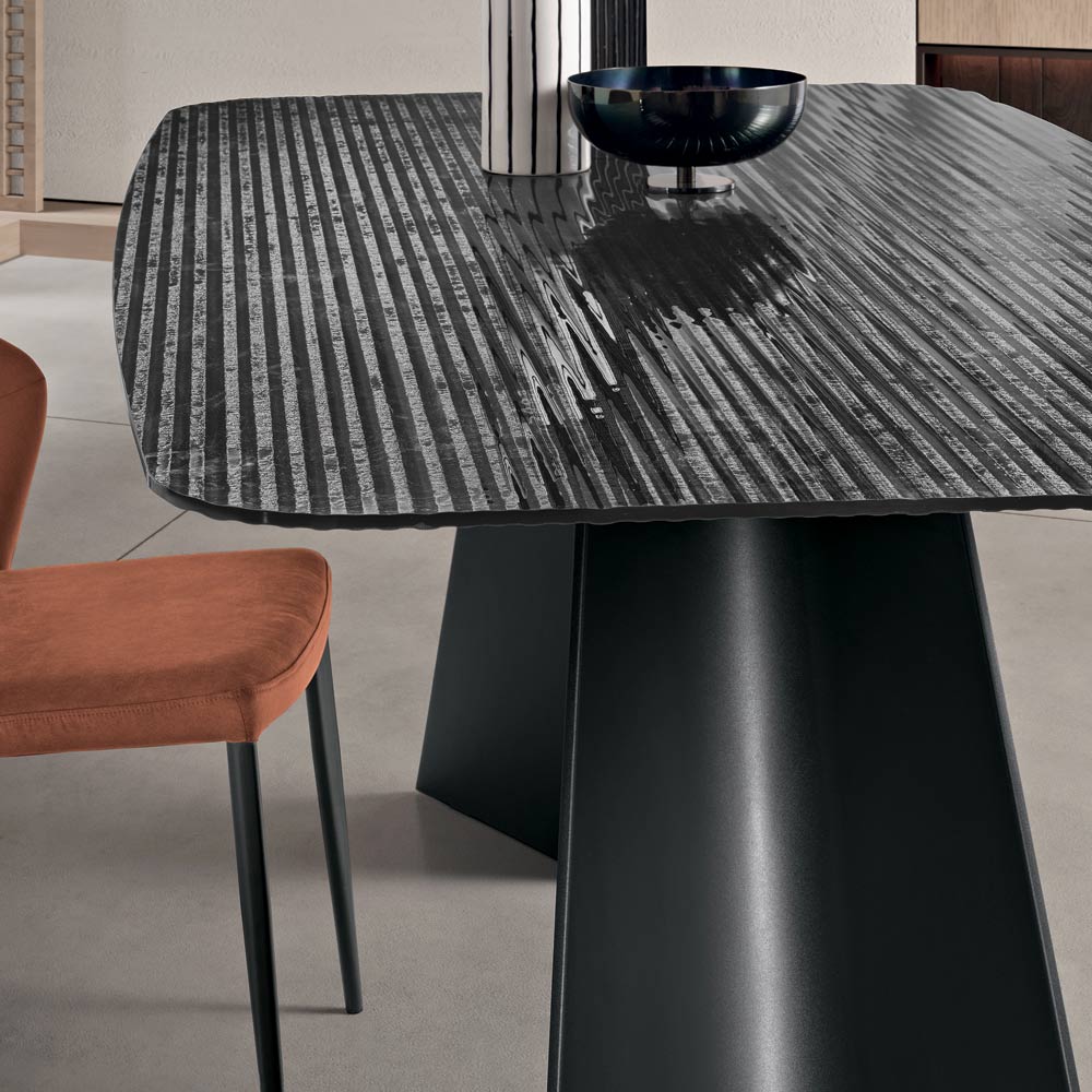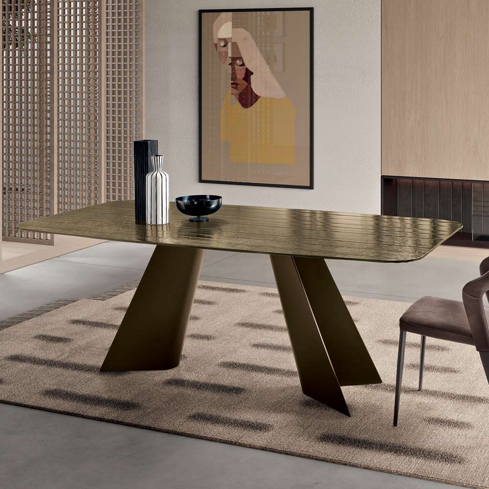 Una refinada mesa de comedor de diseño, fabricada en Italia, diseñada para realzar con elegancia el comedor o la sala de estar . La mesa destaca por su tablero de cristal estriado con acabado plateado en la parte posterior , un material luminoso que refleja la luz, creando sugerentes efectos visuales y aportando un toque sofisticado a la estancia.