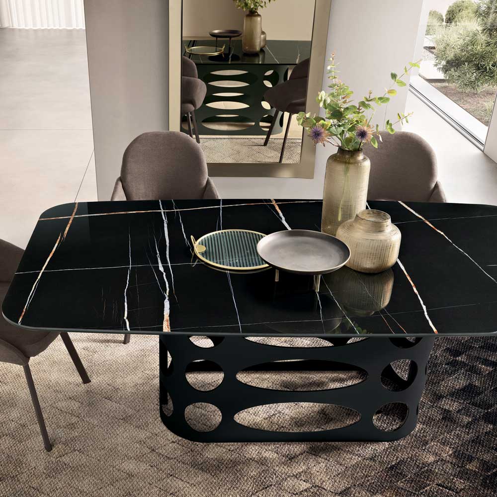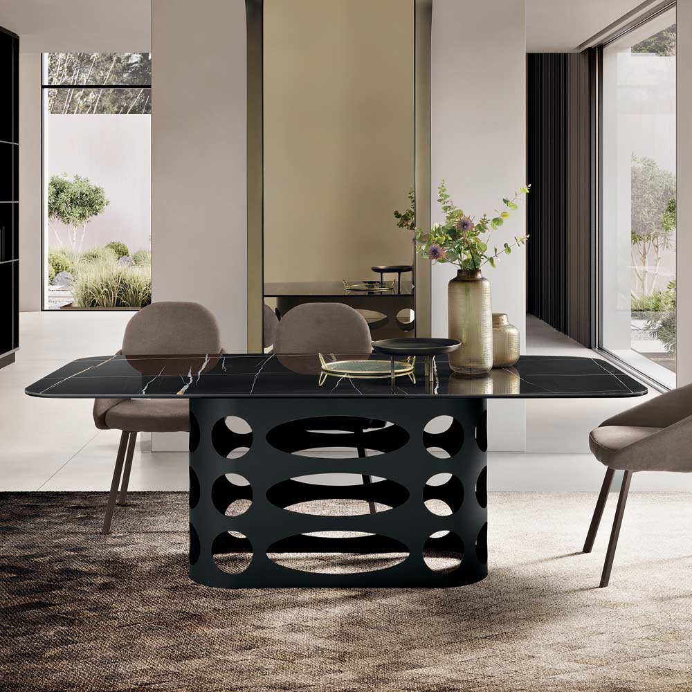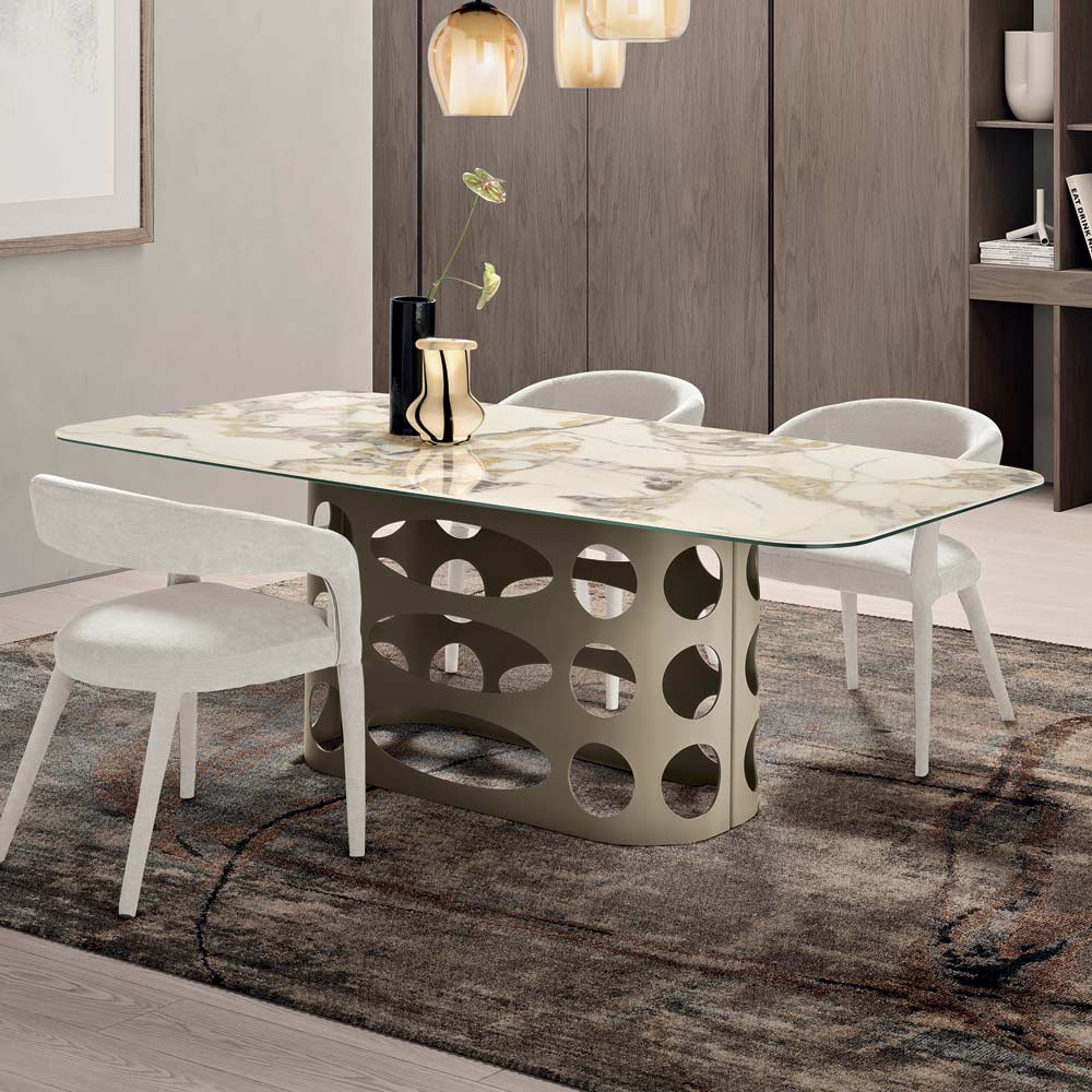 Gracias a la combinación de la materialidad de la cerámica y el diseño perforado de la base, esta mesa representa una solución refinada y contemporánea capaz de realzar cualquier estancia del hogar, convirtiéndose en la verdadera protagonista del comedor.