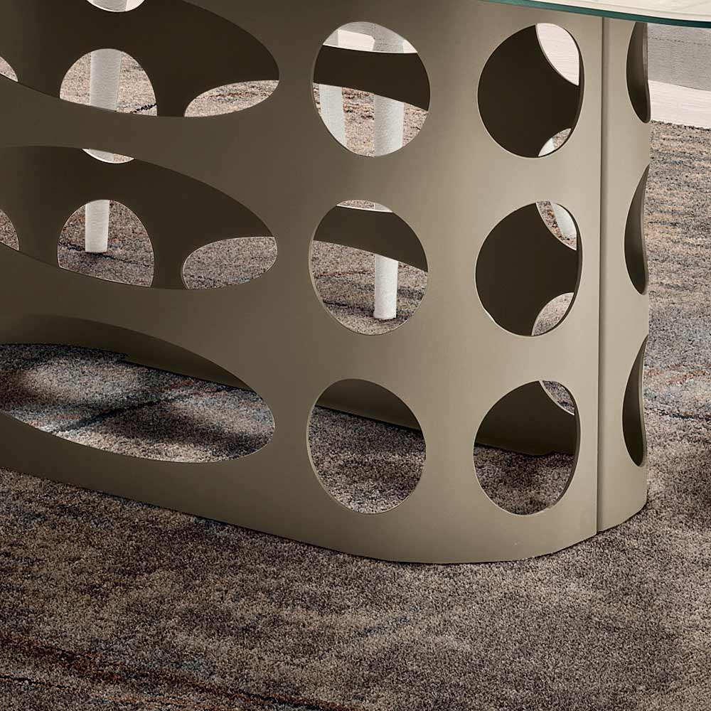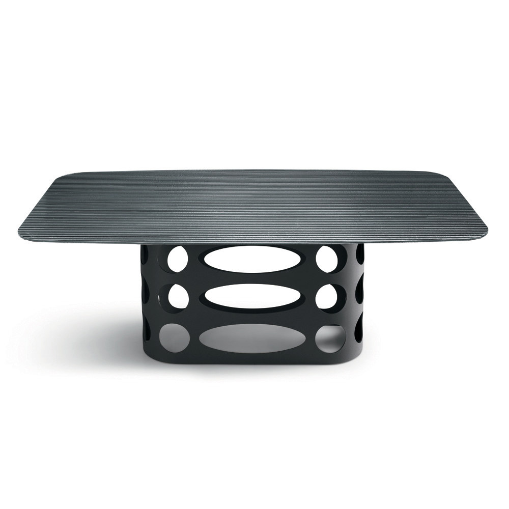 Una refinada mesa de comedor de diseño, fabricada en Italia , ideal para amueblar con estilo su comedor o sala de estar . La mesa destaca por su original base de metal pintado , con elegantes perforaciones elípticas y circulares que crean un llamativo juego gráfico de sólidos y vacíos, otorgando a la estructura un marcado carácter decorativo.