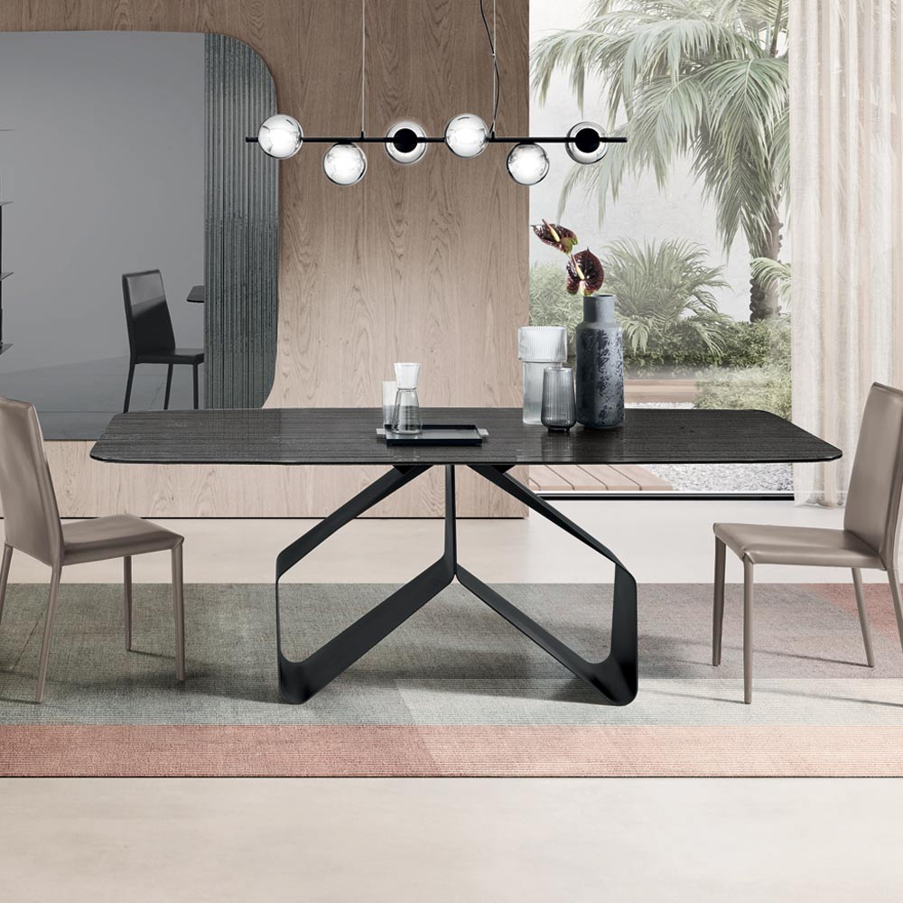 Una elegante mesa de comedor de diseño, fabricada en Italia, diseñada para amueblar con estilo su comedor o sala de estar . La mesa destaca por su original base de metal pintado , que presenta una estructura gráfica ligera y dinámica que recuerda a dos alas estilizadas, creando un fuerte impacto estético a la vez que mantiene un gran equilibrio visual.
