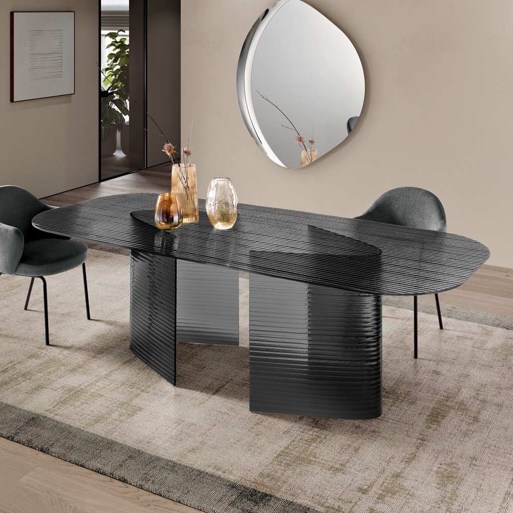 La distintiva base, compuesta por dos elementos curvos, crea una estructura escultórica y dinámica que se convierte en la verdadera protagonista de la mesa. La transparencia del cristal realza el diseño y aporta luminosidad a los espacios, lo que la hace perfecta para ambientes modernos y elegantes.