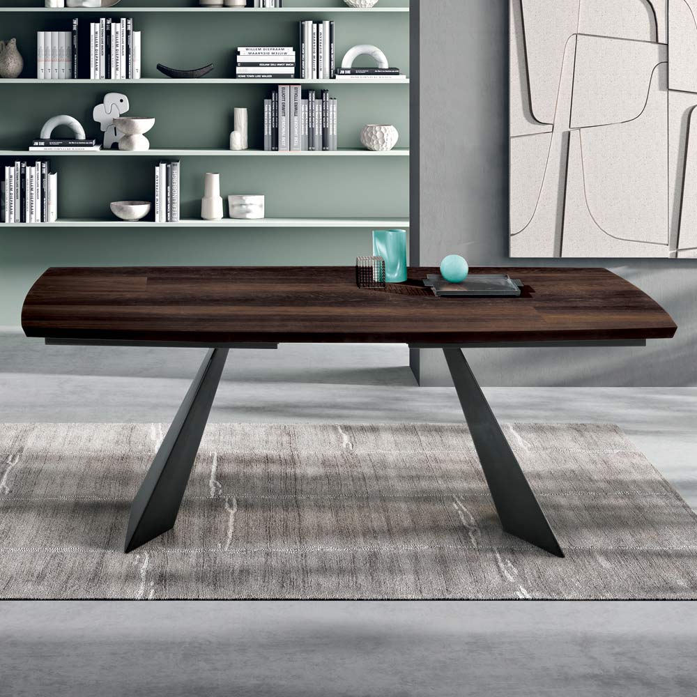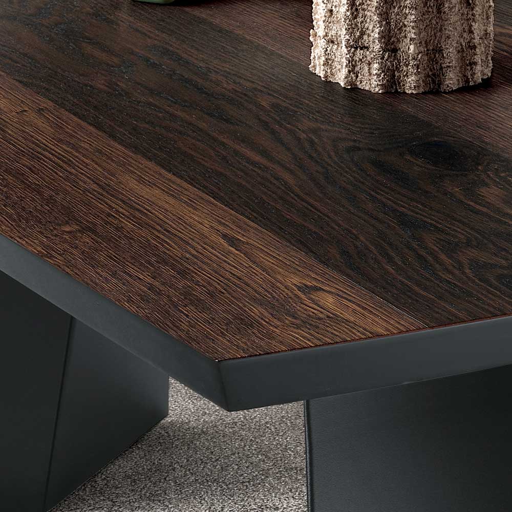 La combinación de metal y madera crea un contraste elegante y contemporáneo, lo que hace que la mesa sea adecuada para una variedad de estilos de decoración. La superficie está disponible en acabados de roble natural y roble térmico , diseñados para realzar la belleza natural de la madera e integrarse fácilmente en ambientes modernos.
