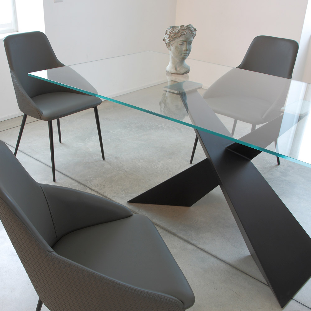 La protagonista absoluta es la base cruzada de metal pintado , con un diseño geométrico y dinámico. Las líneas definidas crean un efecto escultórico y arquitectónico , transformando la mesa en un auténtico elemento de decoración.
