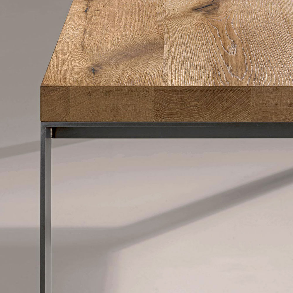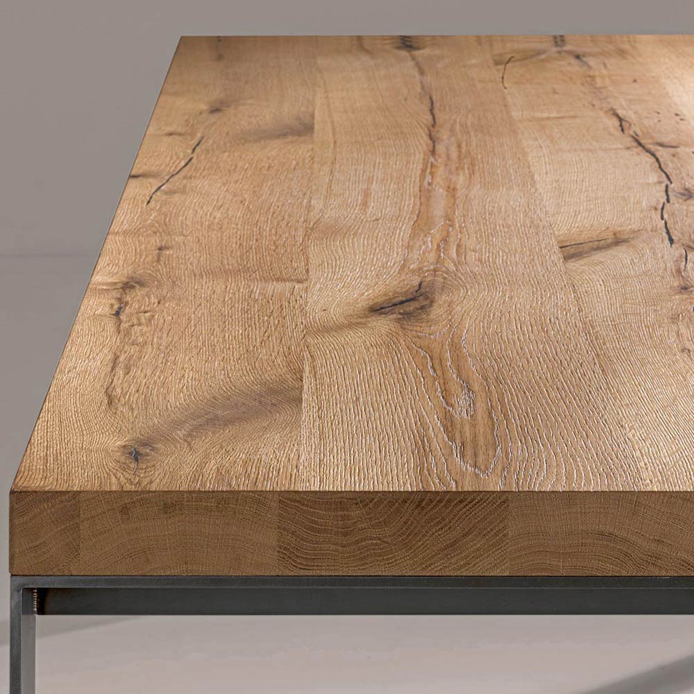 Mesa fija chapada en aglomerado de chopo serraje de roble natural con patas de metal acabado hierro . Dimensiones Al 78 cm, espesor 6 cm.