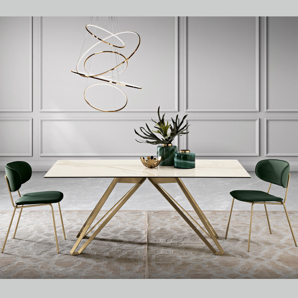 Impresionante por su contraste de materiales y colores, esta mesa es una verdadera expresión de lujo y diseño moderno. La encimera de vitrocerámica efecto mármol calacatta con delicados tonos es una celebración de la elegancia natural, resistente y al mismo tiempo extremadamente refinada.