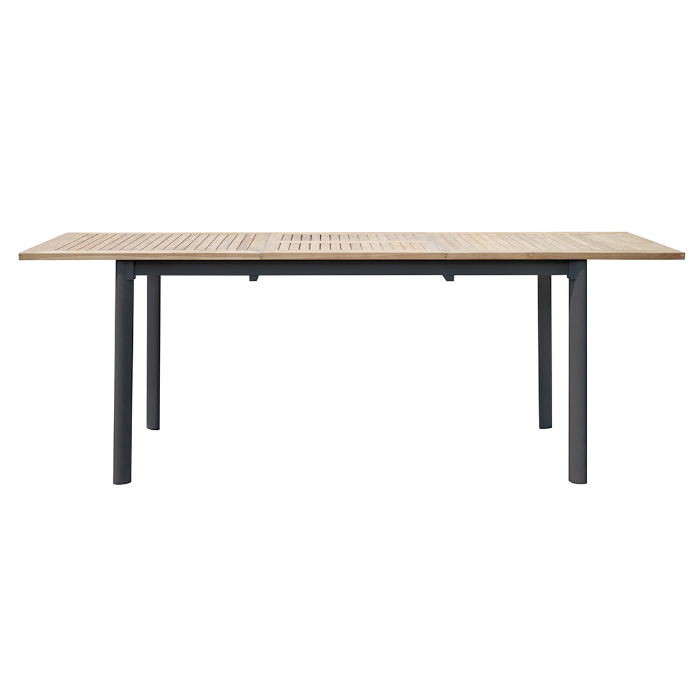 La mesa es extensible , lo que te permitirá adaptarla fácilmente a tus necesidades, tanto si estás organizando una cena íntima como un gran almuerzo con amigos y familiares. La combinación de teca y aluminio no sólo es estéticamente agradable, sino también extremadamente práctica, lo que hace de esta mesa una opción ideal para cualquier ocasión al aire libre.