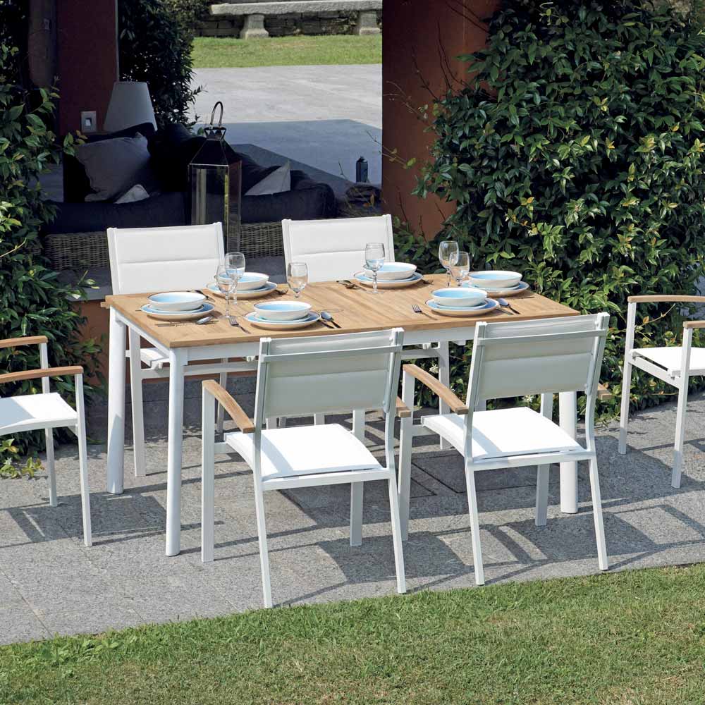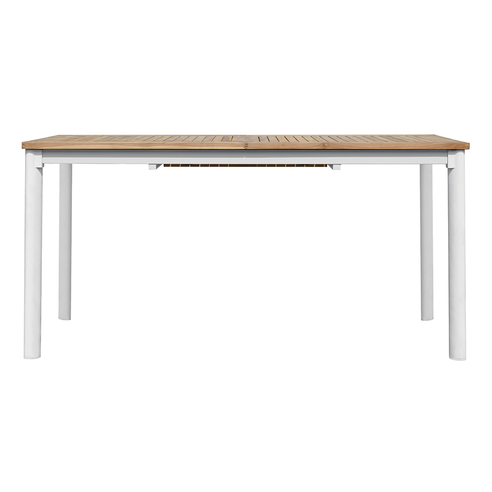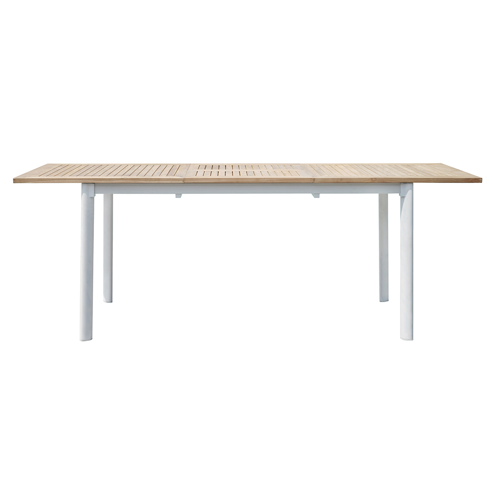 El tablero de la mesa está fabricado en madera de teca de alta calidad, conocida por su durabilidad y resistencia a la intemperie. La teca, con sus cálidos tonos naturales, aporta un toque de calidez y sofisticación a tu espacio exterior. Las patas de aluminio , resistentes y livianas, ofrecen una excelente estabilidad y resistencia a la corrosión, lo que garantiza que la mesa conserve su belleza con el tiempo.
