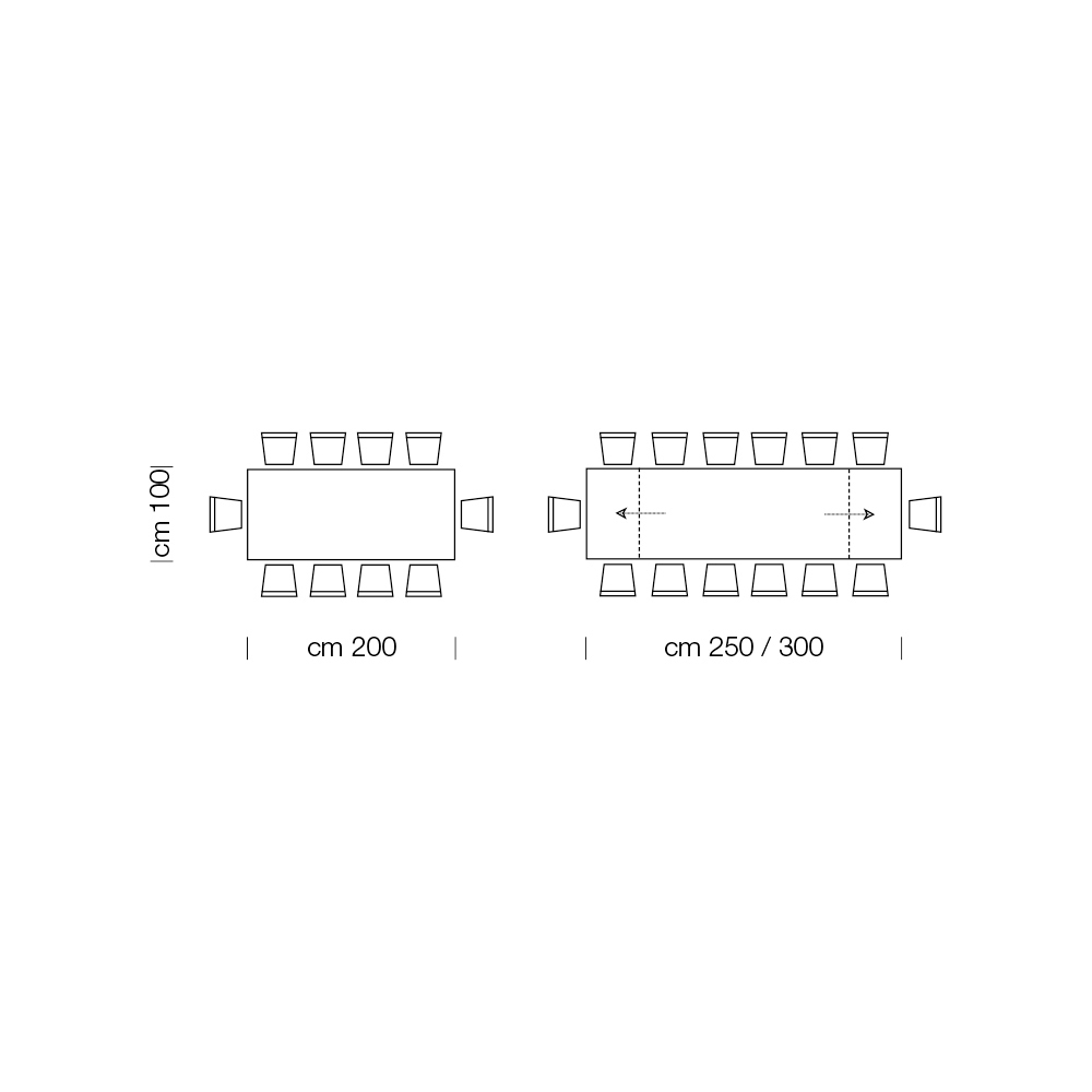 - L 200 (300) x P 100 x H 76,5 cm 14 plazas extensible con dos extensiones externas de 50 cm.