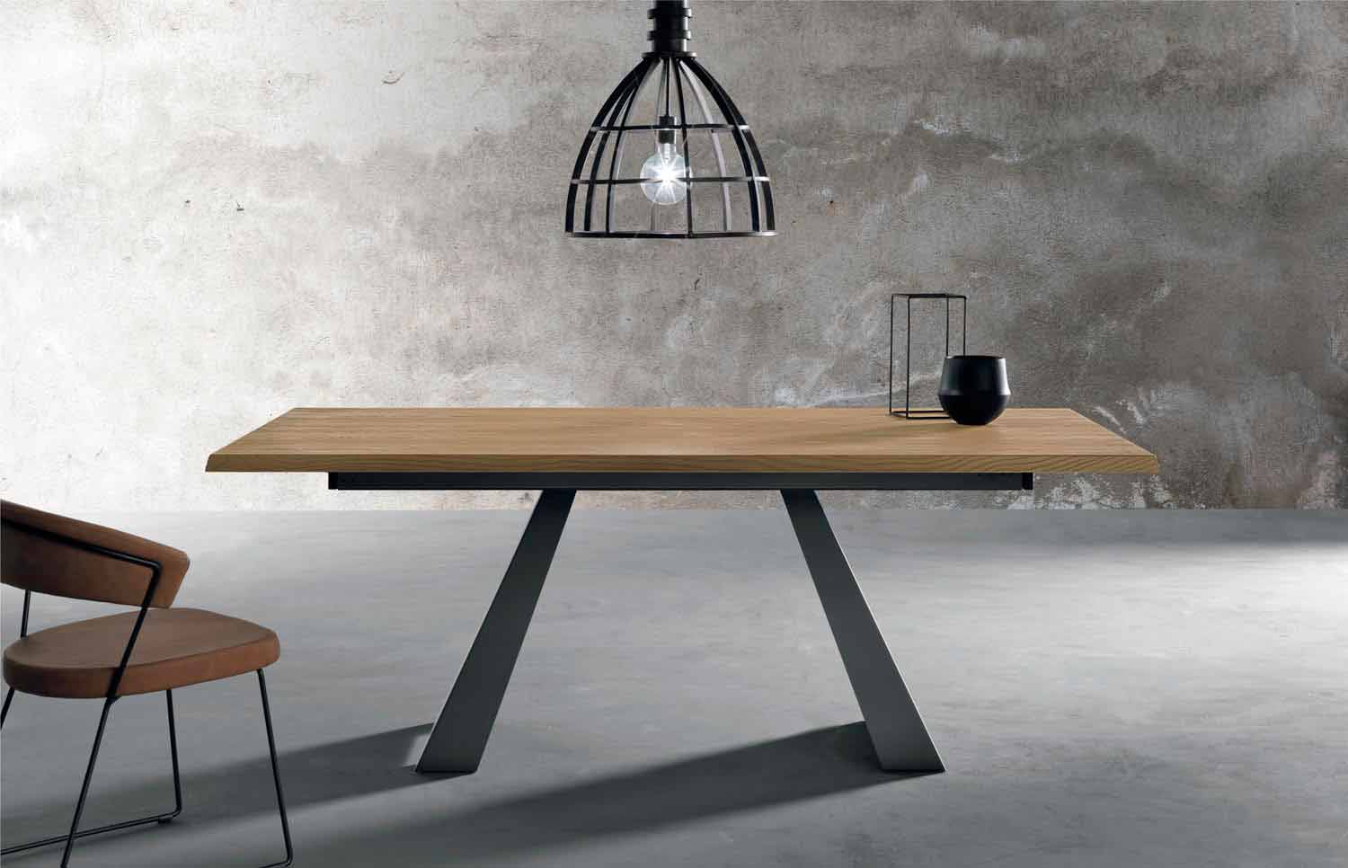 la mesa de comedor extensible con desplazamiento lateral adecuada a cualquier contexto decorativo gracias a la unión de la madera con el metal.