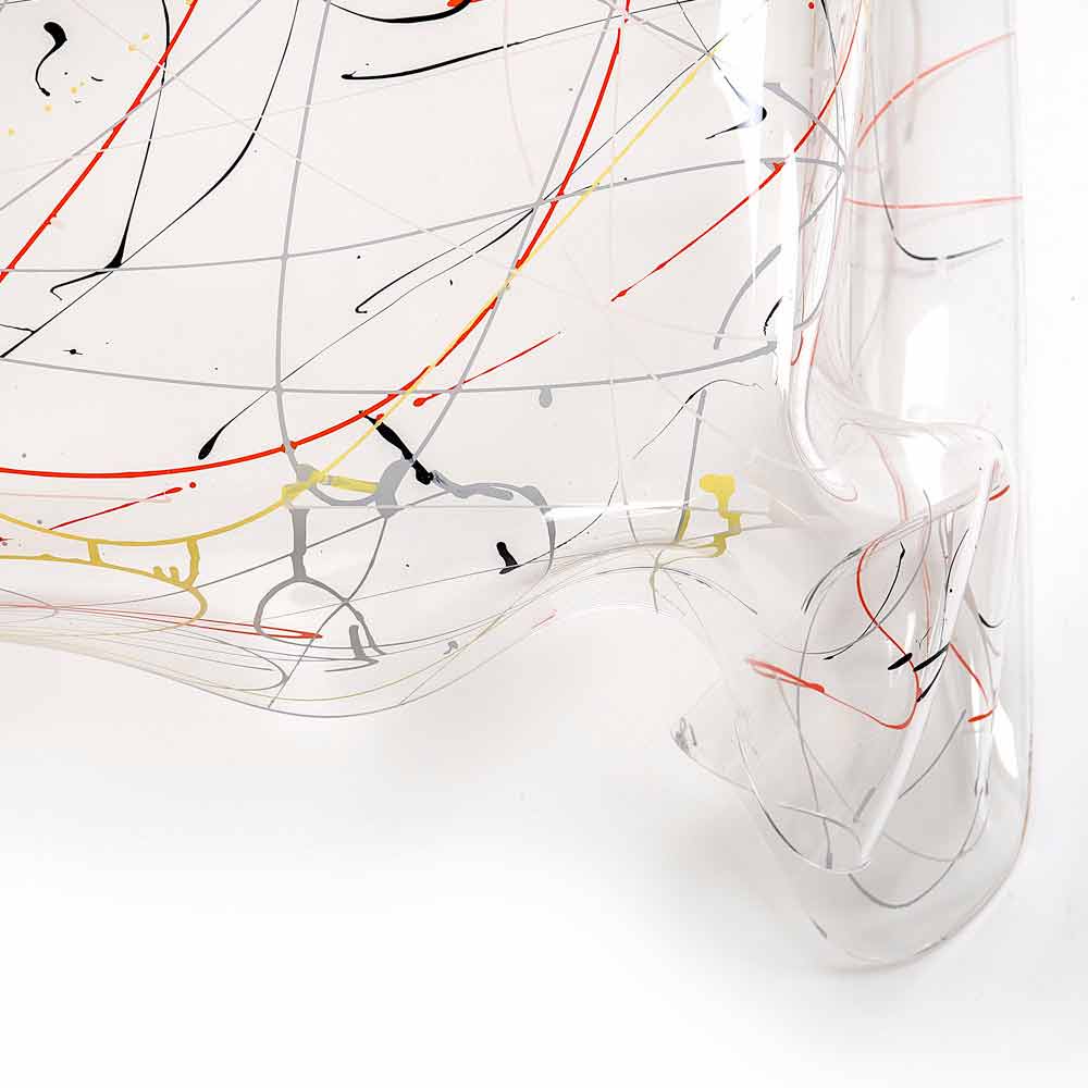 Una lámina de polímero virgen puro 100% de plexiglás PMMA con pintura en aerosol; Se cubre a mano a altas temperaturas para crear una tabla única e irrepetible. La estructura construida es totalmente autoportante.