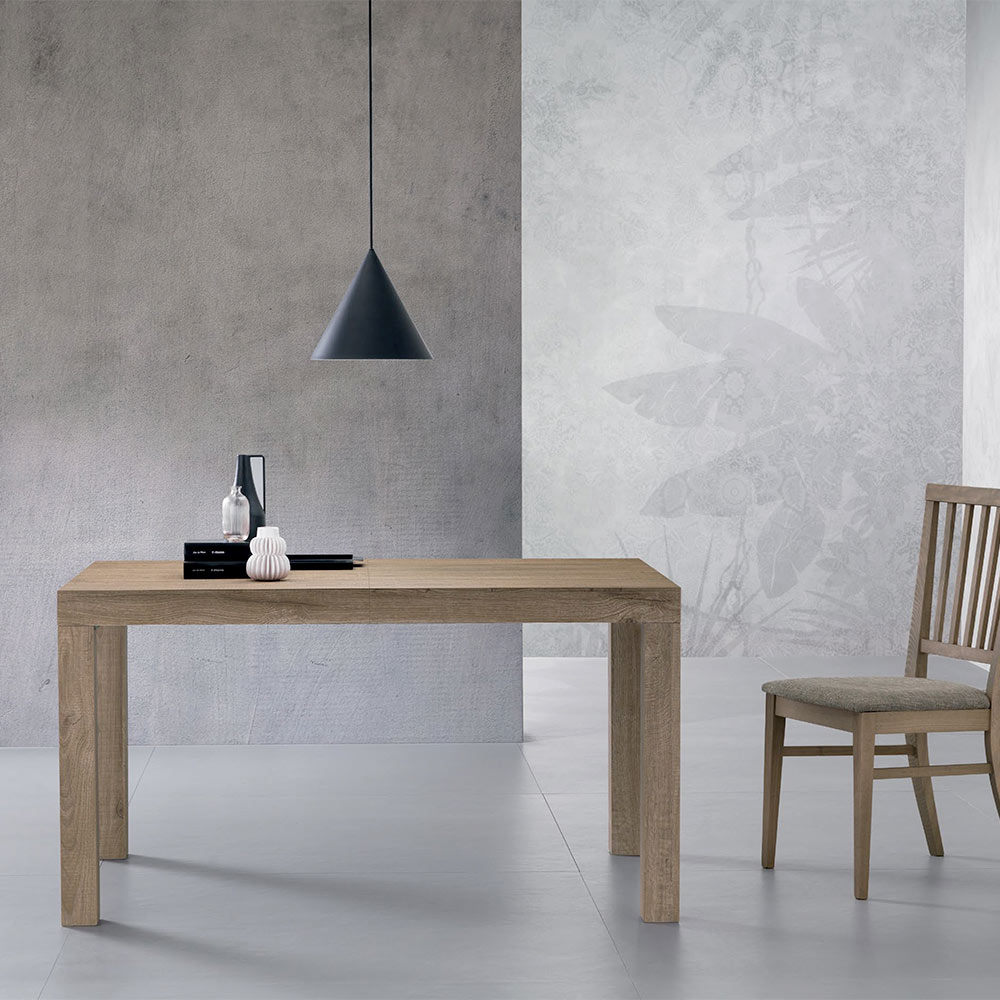 Esta mesa es un auténtico ejemplo de diseño minimalista que no sacrifica ni la resistencia ni la funcionalidad. Fabricada en laminado con acabado roble, que realza la textura y la calidez del material, destaca por su sólida estructura y la elegancia de sus líneas puras y limpias. Su forma cuadrada y su amplio tablero crean un ambiente acogedor y agradable, perfecto para amueblar su comedor con estilo.