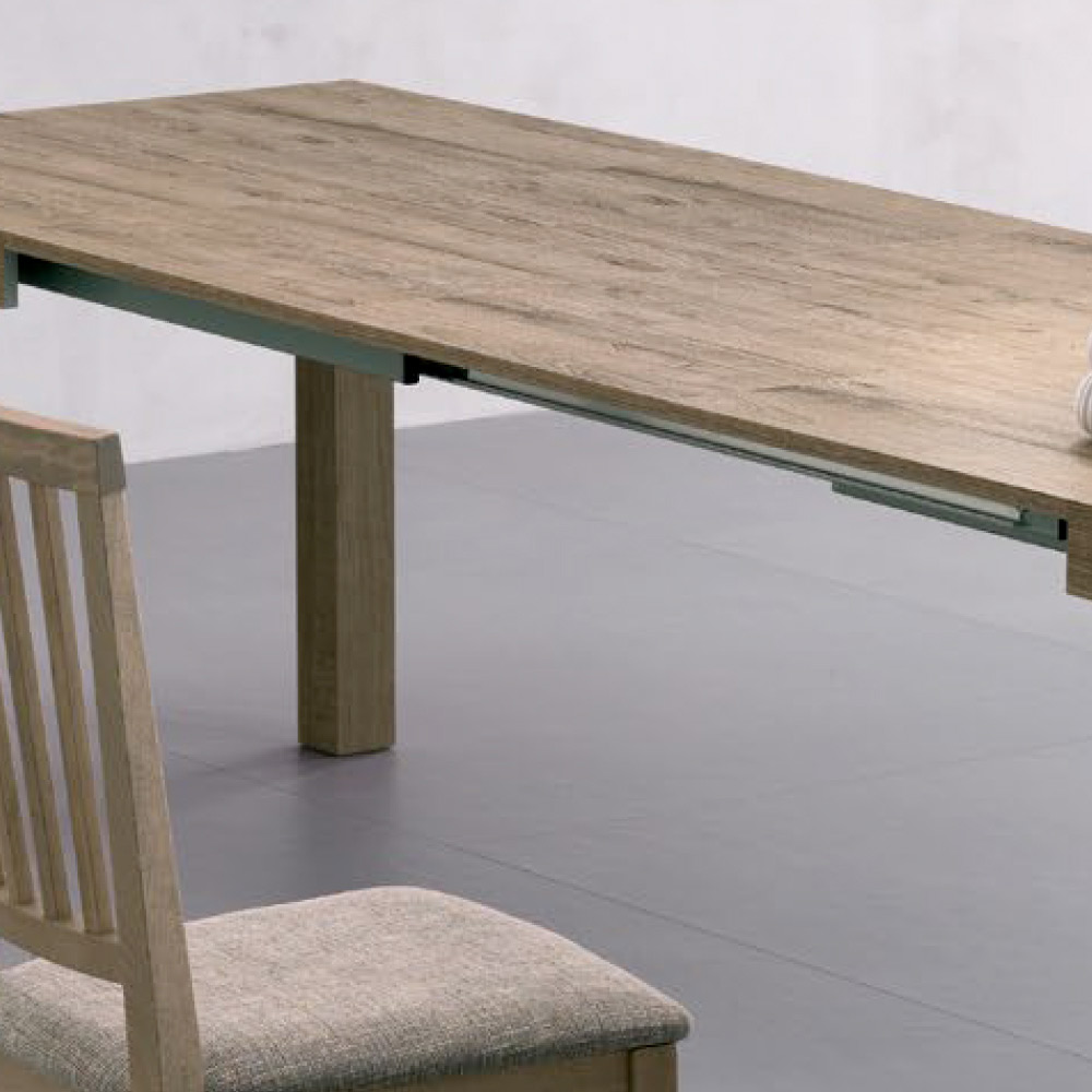 Mesa rectangular extensible con tablero laminado. Acabado plegable de 80 mm de espesor.