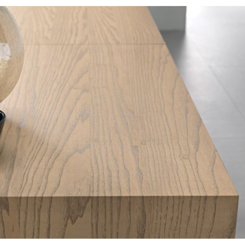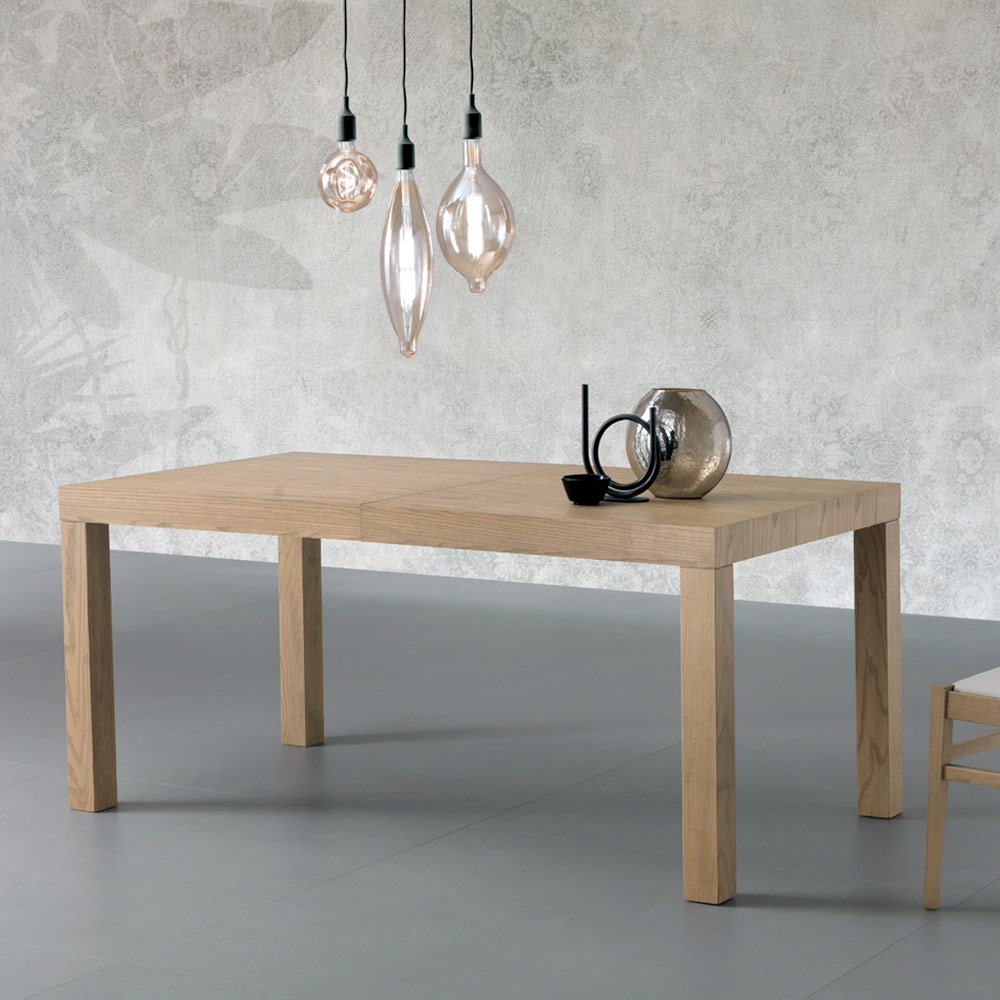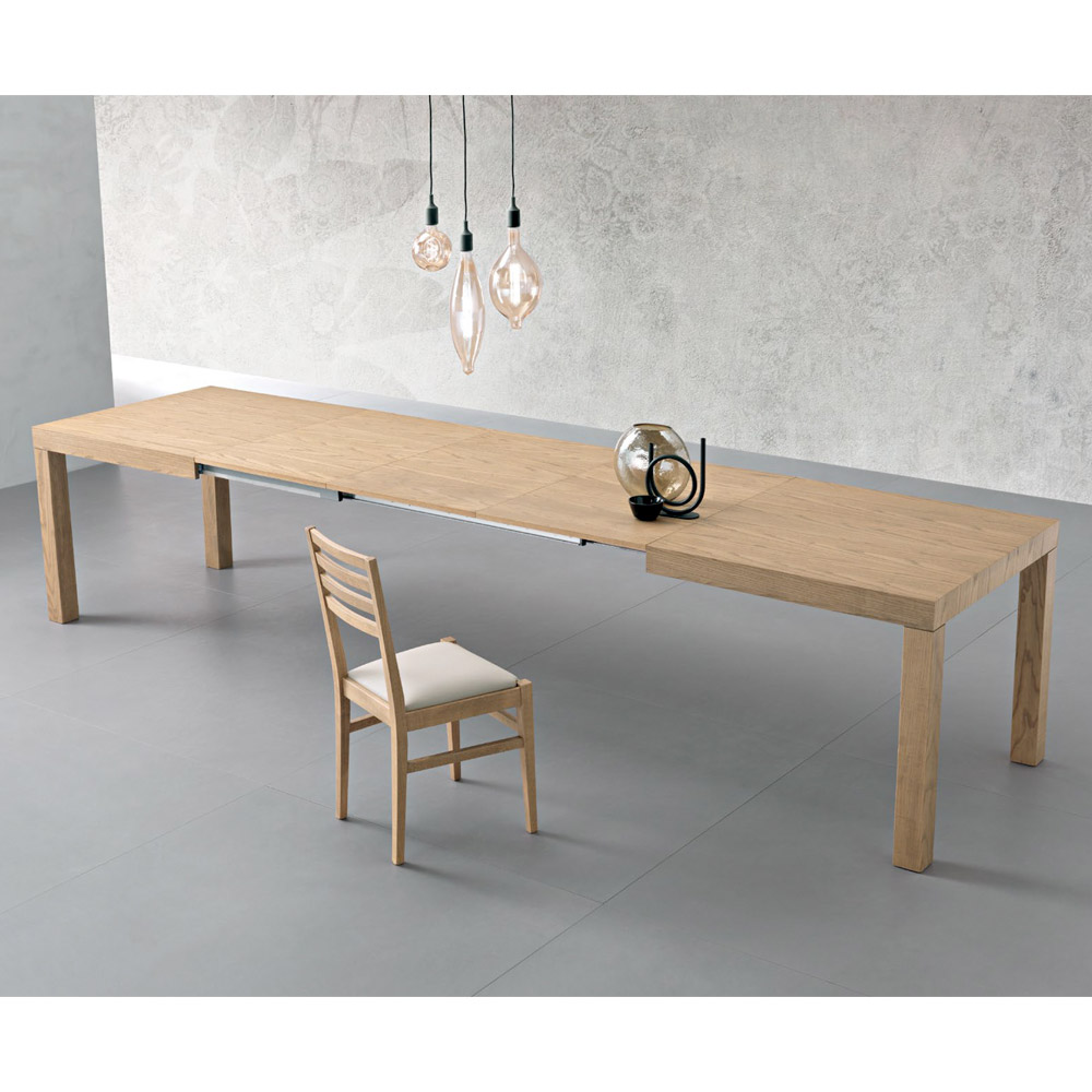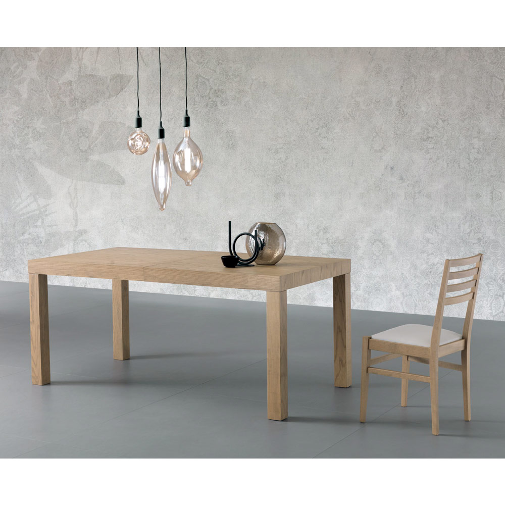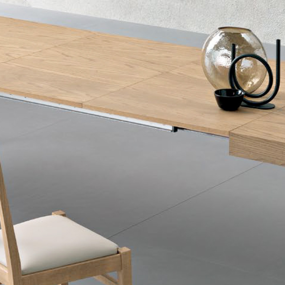 Mesa rectangular extensible con tablero chapado en fresno de 80 mm de espesor, acabado plegable.