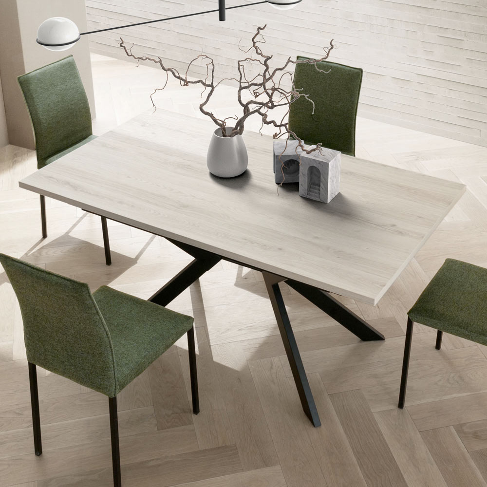 La base, de metal pintado y con un diseño geométrico cruzado, ofrece estabilidad y un toque escultural que no pasa desapercibido. Una solución de mobiliario perfecta para comedores, espacios abiertos o entornos contract con un estilo refinado.